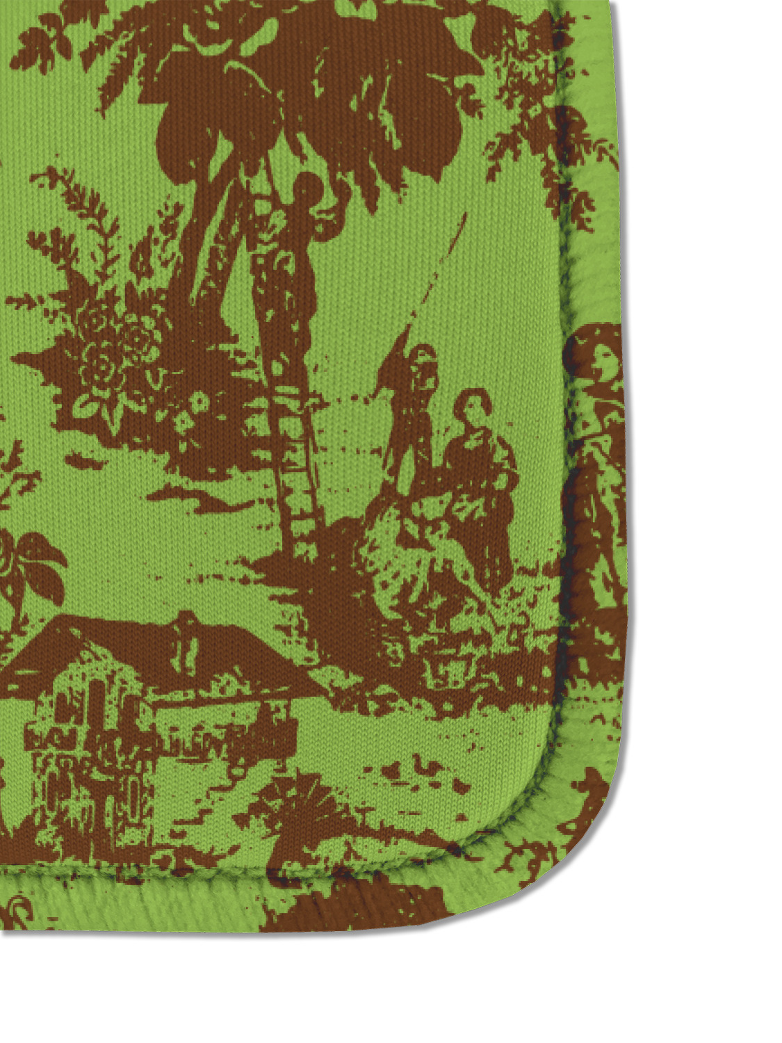 Old world toile just got dressed up. Toile has been around forever but we have taken a centuries old design and brought it to the present and beyond. We took the traditional toile design and modernized it by using brown and green. The toile pattern on top is created in brown which pops on a backdrop of green. On the bottom we have used the very modern chevron pattern in the same green and brown.
