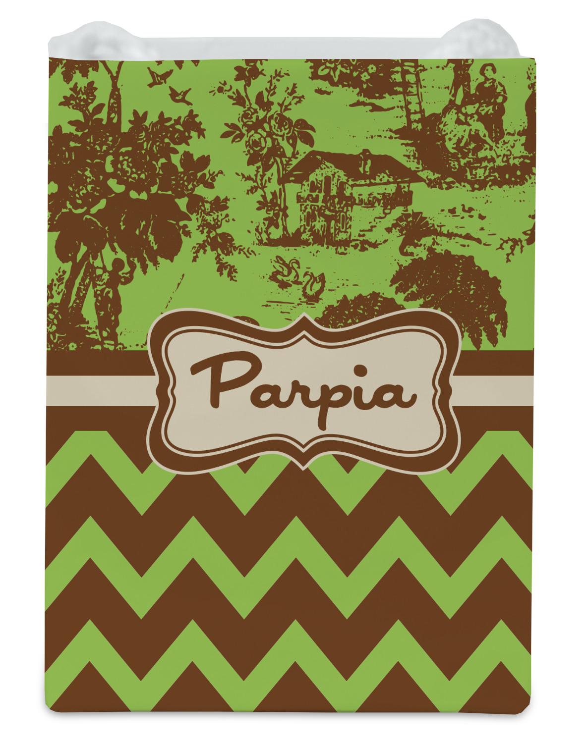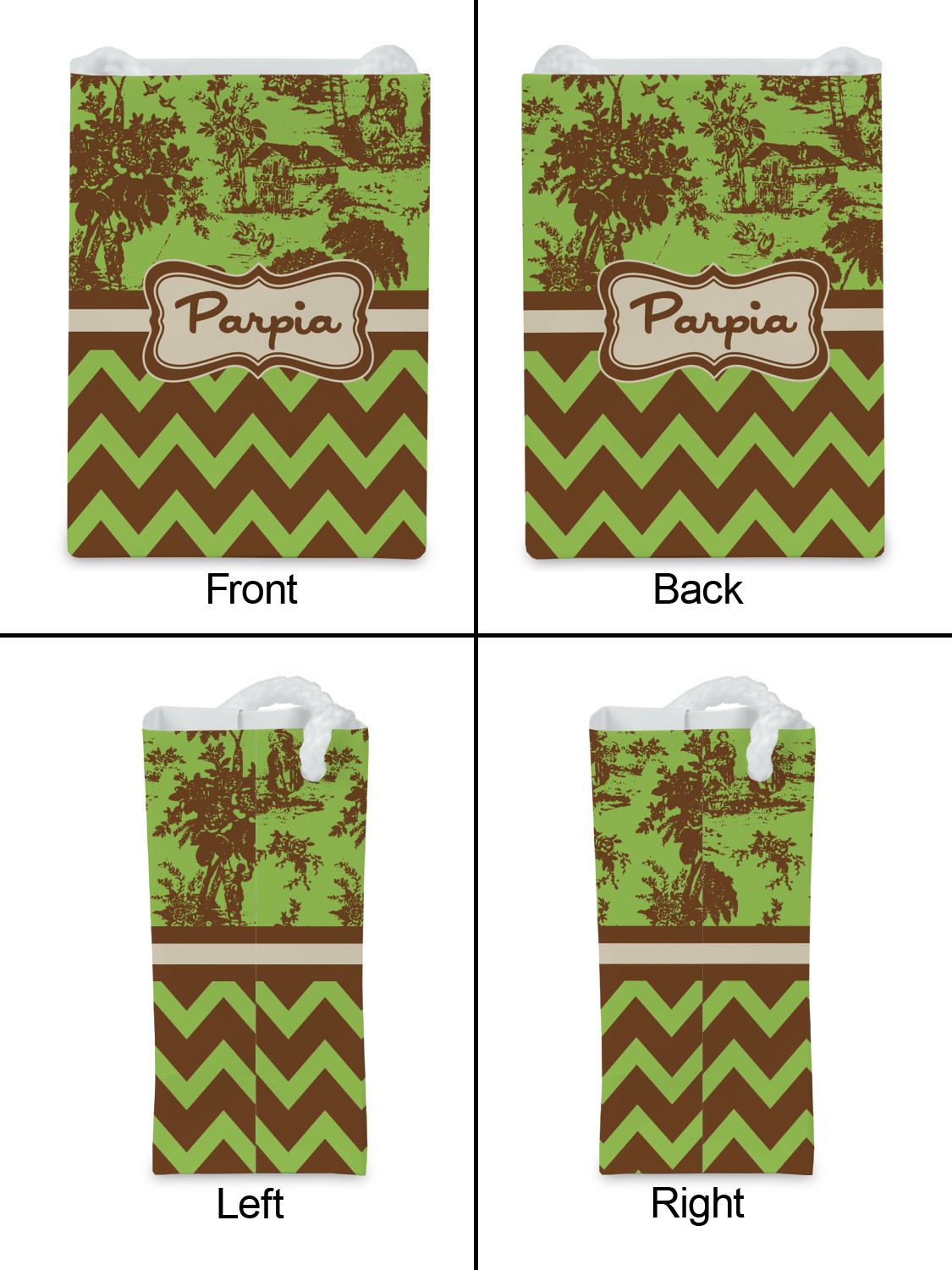 Old world toile just got dressed up. Toile has been around forever but we have taken a centuries old design and brought it to the present and beyond. We took the traditional toile design and modernized it by using brown and green. The toile pattern on top is created in brown which pops on a backdrop of green. On the bottom we have used the very modern chevron pattern in the same green and brown.