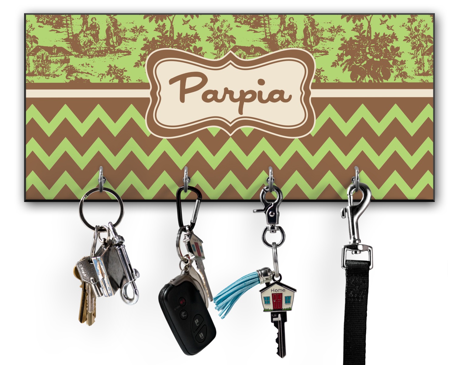 This 11" x 5" key hanger is made of sturdy wood and has four metal hooks lining the bottom. This is the perfect size for a family with several drivers. Not only can you hang keys on it though, but pet leashes and other small items. The board is black on the sides and back and is printed with the design of your choice on the front.