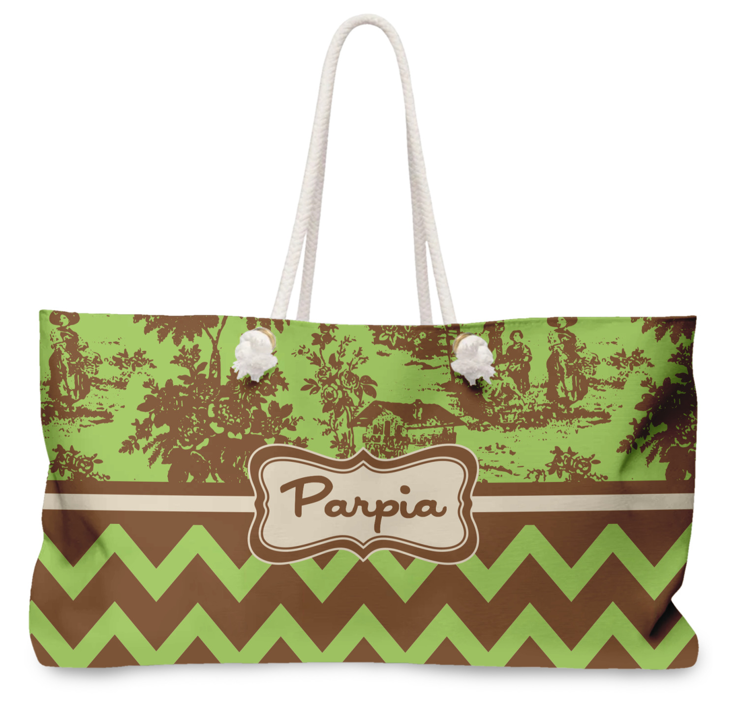 Our oversized weekender tote with rope handles is perfect for your weekend at the beach or on the town. This large tote are 24" W X 13" H, with a 5" gusset and a 27" thick rope handles with a knot that is put through a grommeted brass hole.