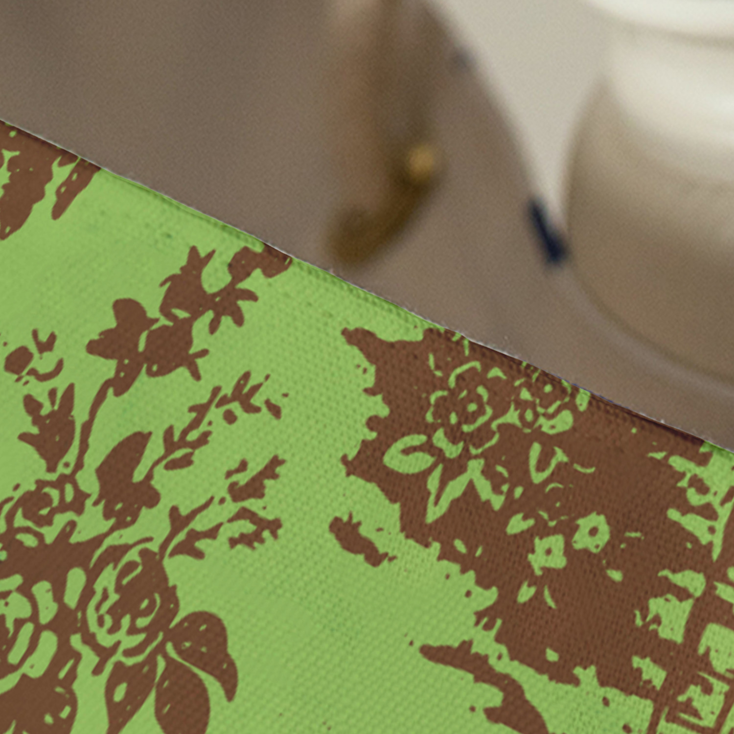 Old world toile just got dressed up. Toile has been around forever but we have taken a centuries old design and brought it to the present and beyond. We took the traditional toile design and modernized it by using brown and green. The toile pattern on top is created in brown which pops on a backdrop of green. On the bottom we have used the very modern chevron pattern in the same green and brown.