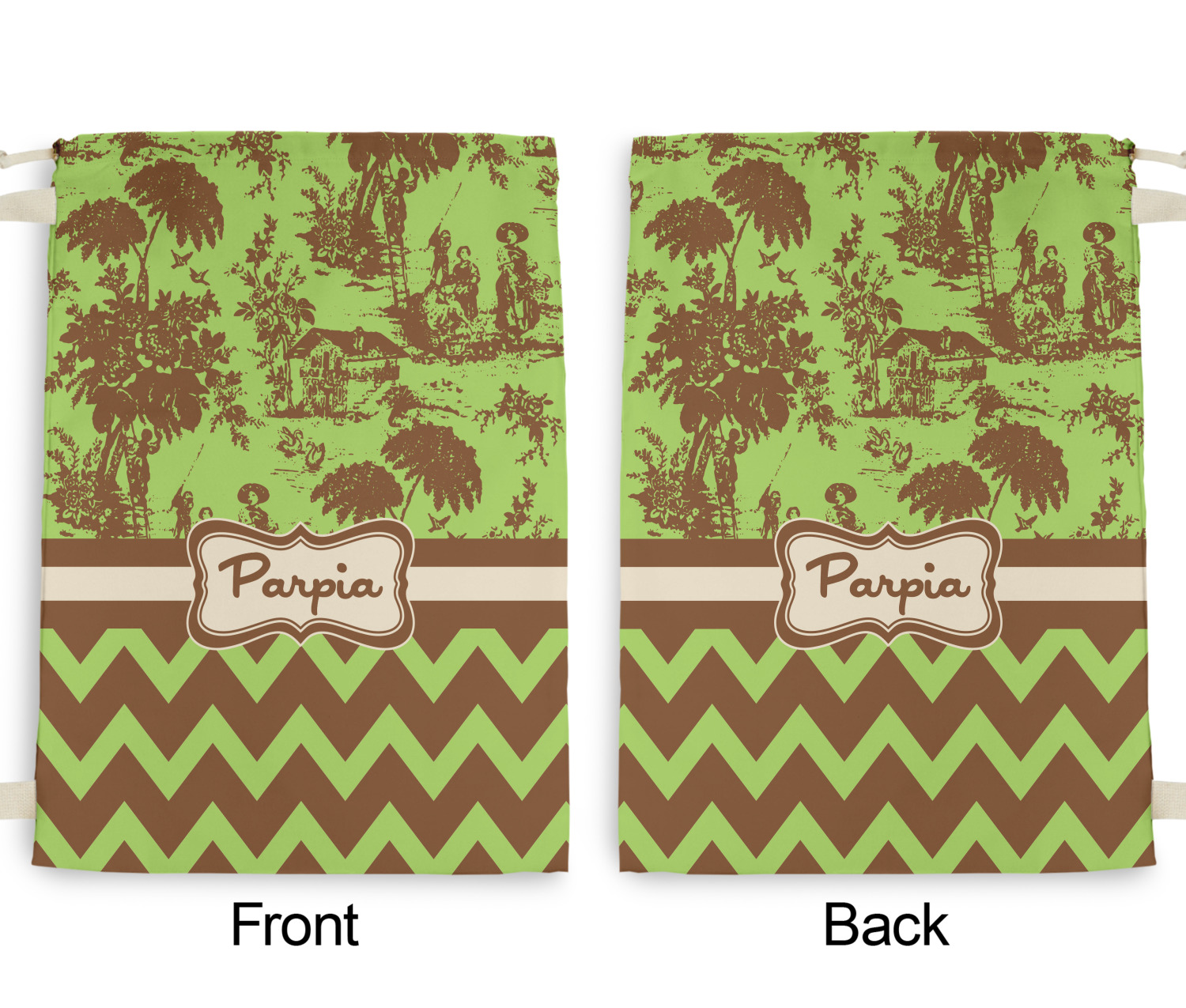 Old world toile just got dressed up. Toile has been around forever but we have taken a centuries old design and brought it to the present and beyond. We took the traditional toile design and modernized it by using brown and green. The toile pattern on top is created in brown which pops on a backdrop of green. On the bottom we have used the very modern chevron pattern in the same green and brown.