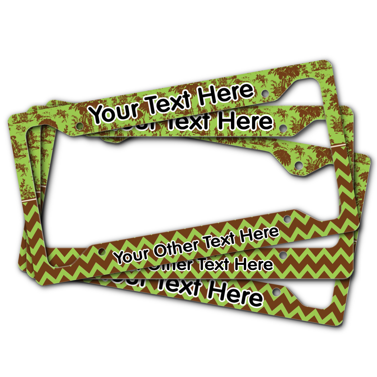 Each customizable license plate frame is made from a fine, yet sturdy aluminum material that measures approximately 6.5 x 12.15 inches, accommodating most standard license plates. The thickness allows the license plate frame to adhere completely to your license plate for a seamless look. We carry 3 styles of license plate frames to customize - Style A has texts on top and bottom, Style B offers texts on top and bottom as well as a full fill bottom border, and Style C offers text at the bottom only. The personalized license plate frame comes with four mounting holes for easy installation! We print each custom design across the frame with a glossy finish.