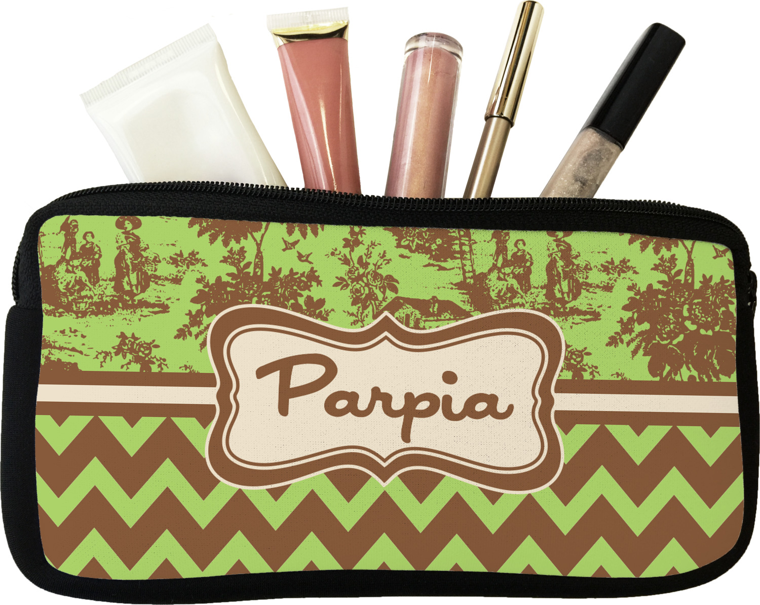 Our personalized makeup bags are available in many different designs, patterns and colors - so you are sure to find one that will love. They are made of neoprene (same material as wet-suits) and thus are water resistant, so spillages in your makeup bag will not end up all over you purse. They are customized on one side and are black on the other side and the zipper is black as well.