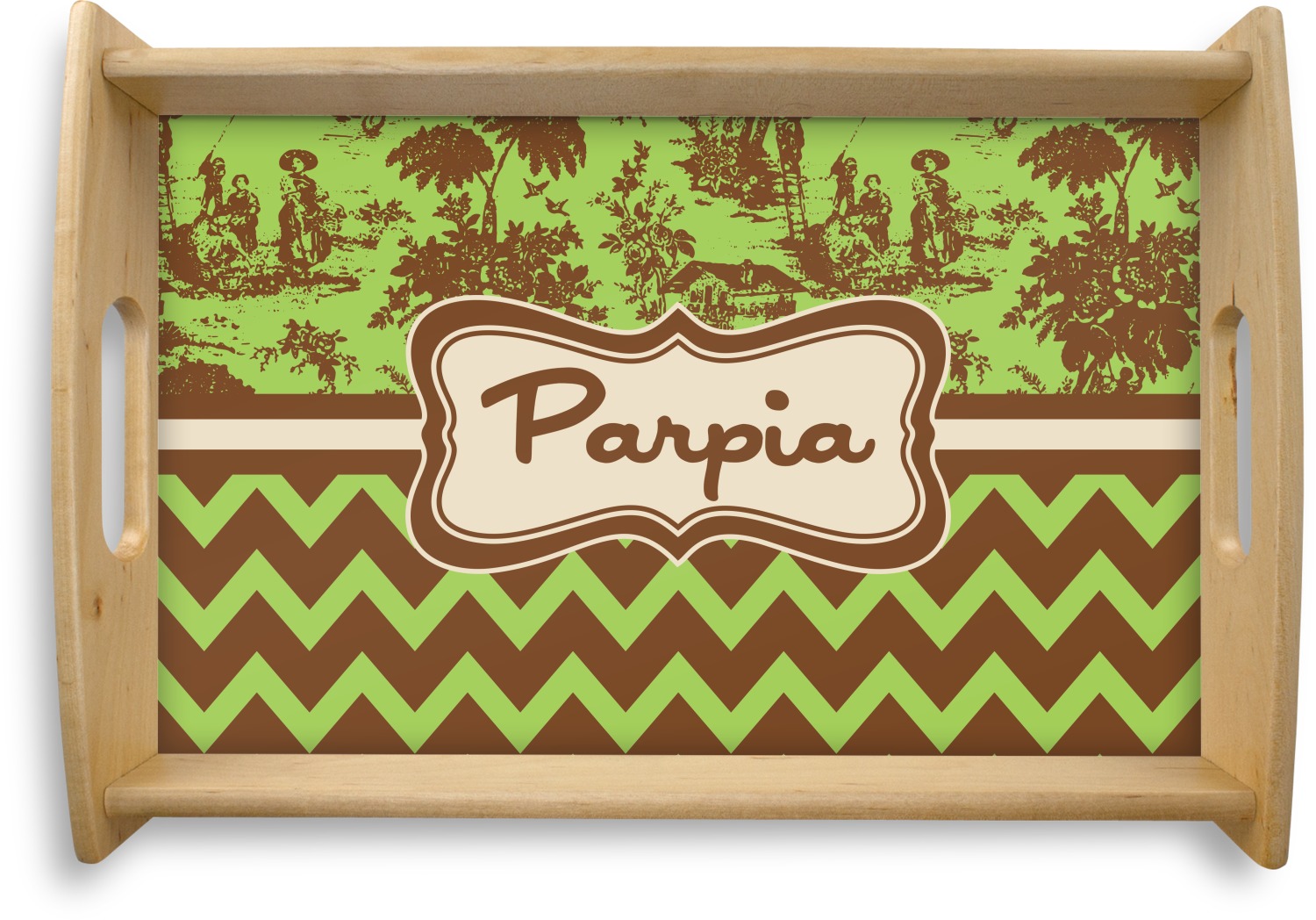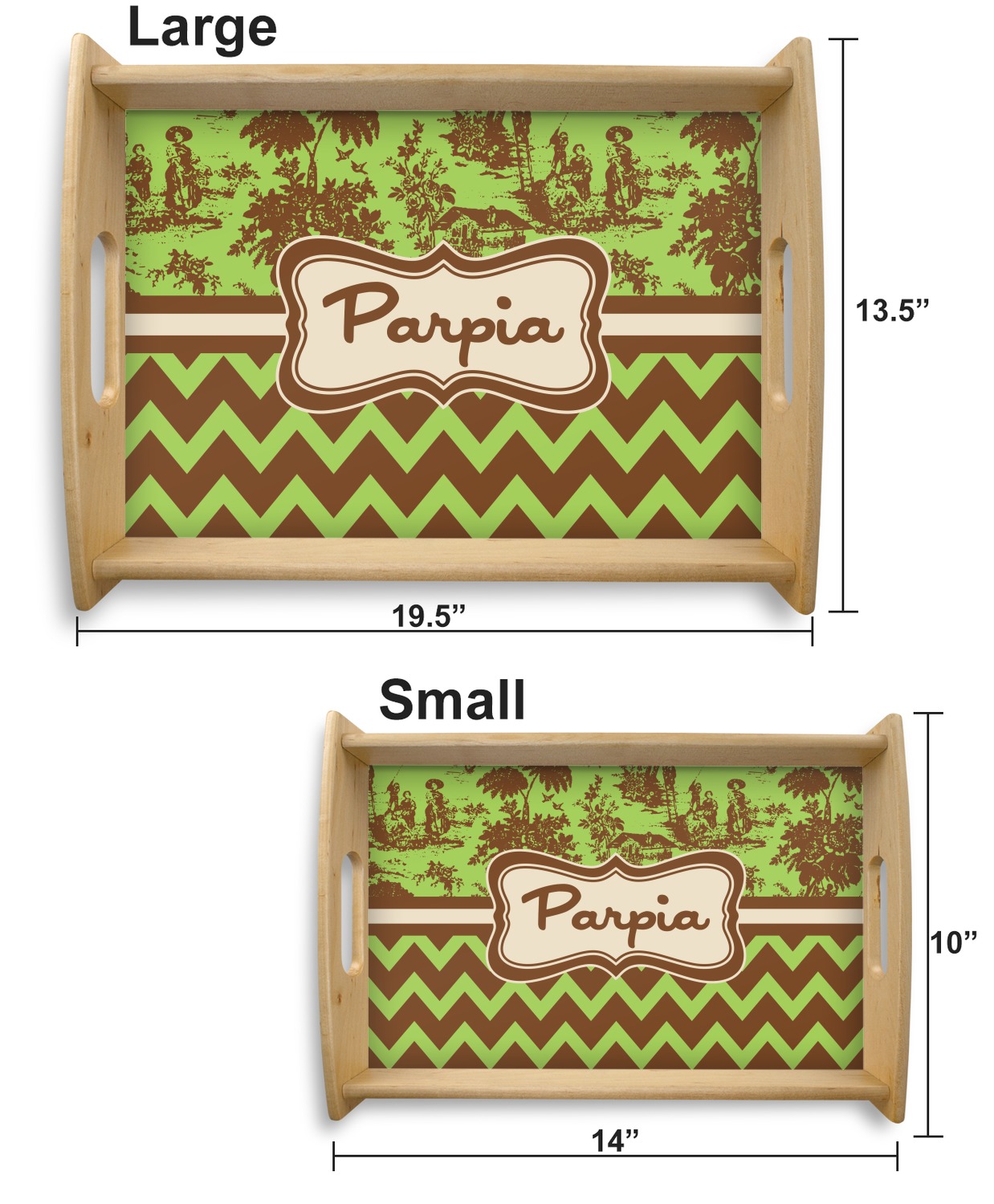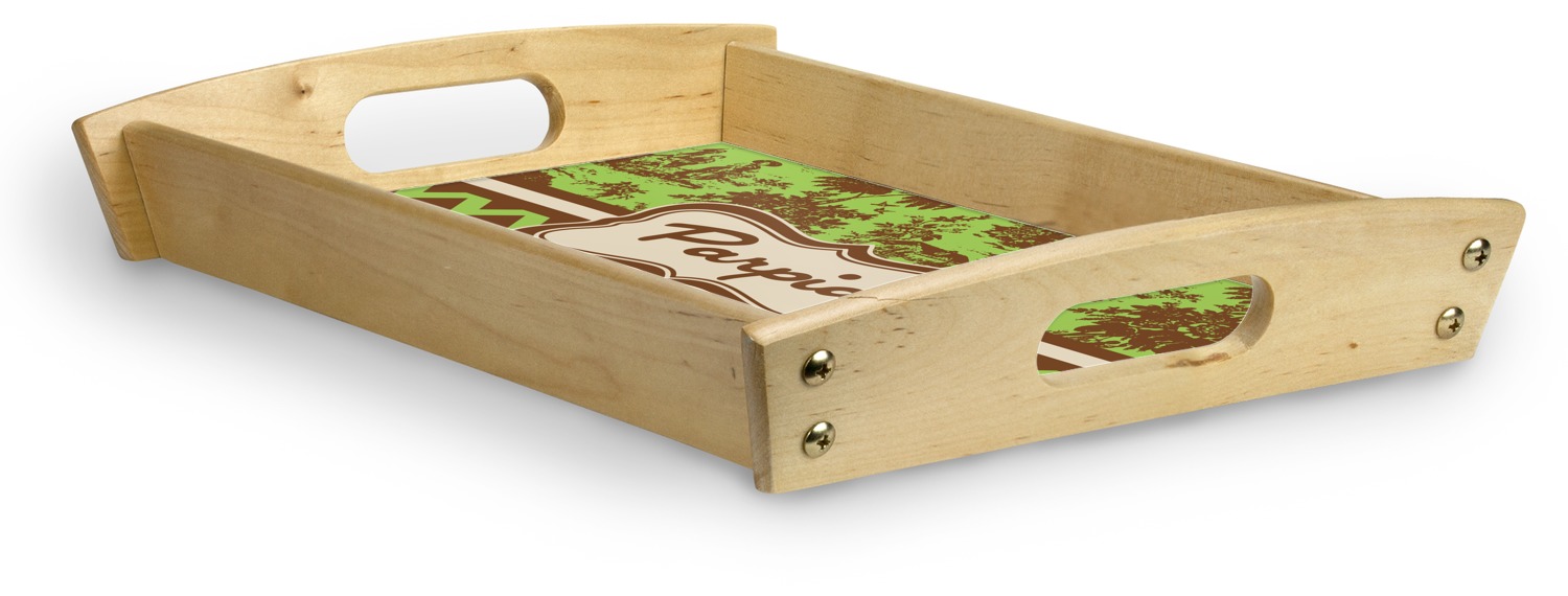 This serving tray with handles features square edges and two rounded sides, creating a very modern look. Each side is fabricated from a beautifully cut, natural wood. The bottom of the interior of the tray displays your customized design in bright, vibrant color. The tray is sold in both a black color and a natural wood look. Each variation of the wood serving tray has two sizes: Small, which is 14" x 10" x 2.25", and Large, which is 19.5" x 13.5" x 2.75".