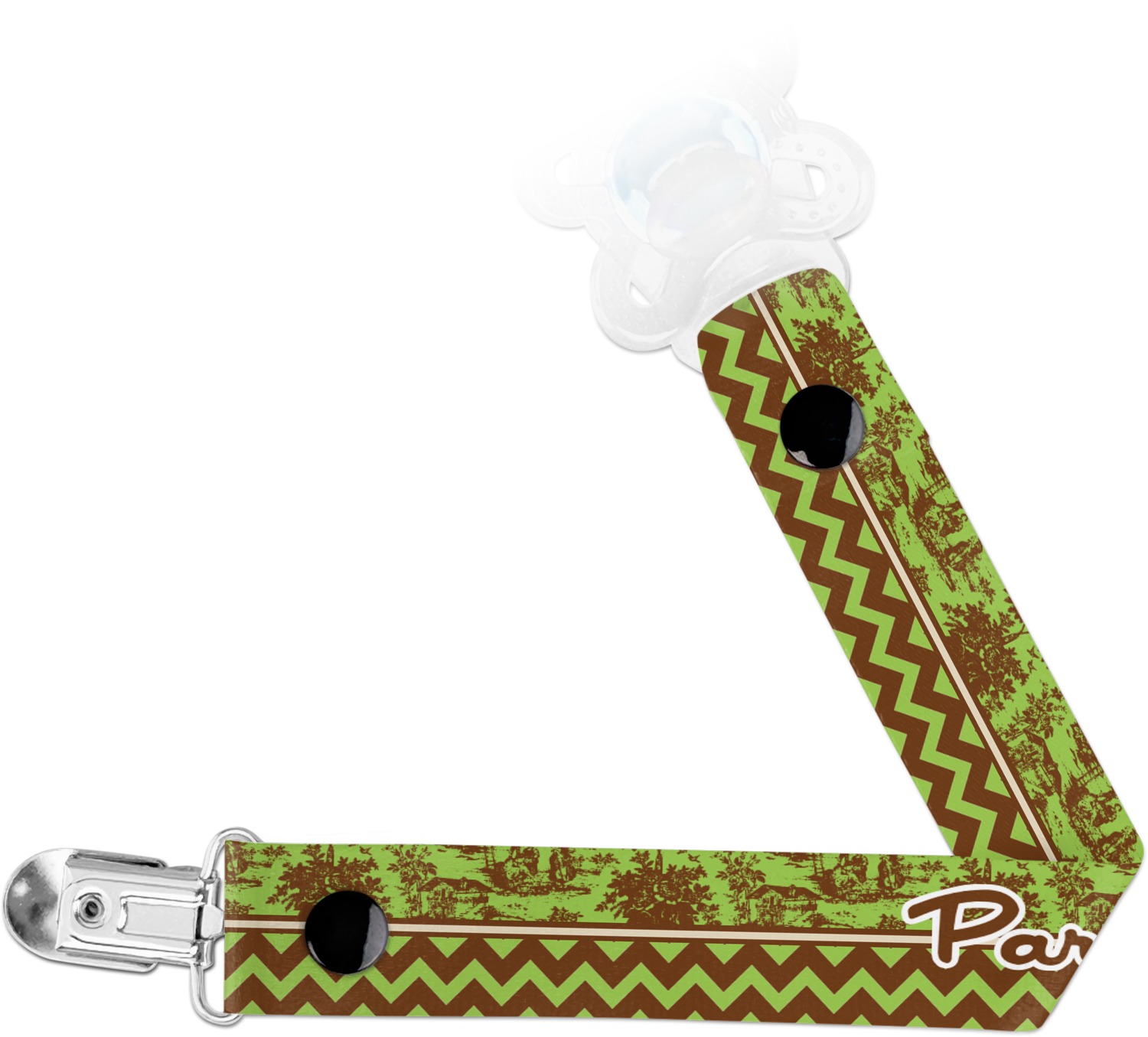 This personalized pacifier clip is the ideal size and measures at approximately 7.5 inches in length, when either end is snapped closed. On one end, you'll find a snap button. This button of your baby's pacifier holder is what can be attached to their pacifier to hold is securely in place. Simply open the snap, slip it through the pacifier opening, and snap it back into place. On the opposite end of this baby pacifier holder, you'll find a metal clip that can secure to a baby's collar or sleeve. This clip ensures that the strap stays in place, and that your baby's pacifier is always on hand.