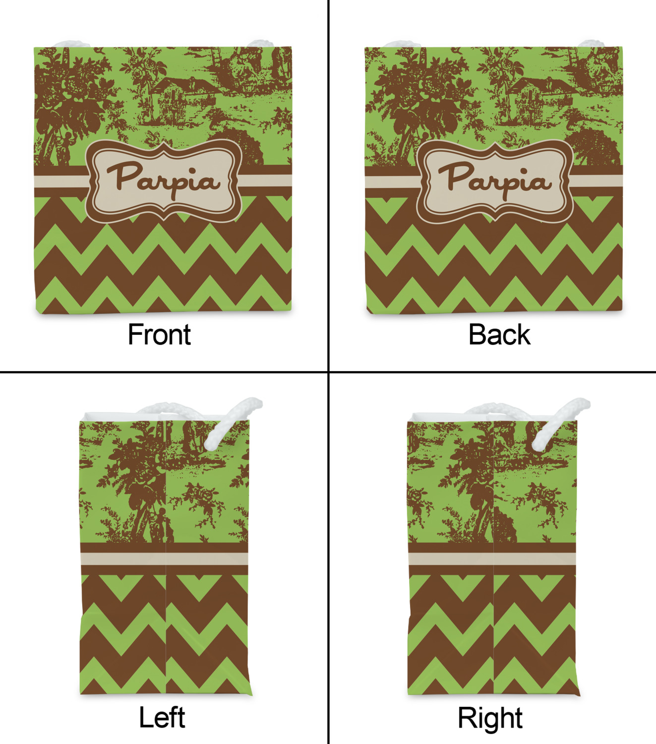 Old world toile just got dressed up. Toile has been around forever but we have taken a centuries old design and brought it to the present and beyond. We took the traditional toile design and modernized it by using brown and green. The toile pattern on top is created in brown which pops on a backdrop of green. On the bottom we have used the very modern chevron pattern in the same green and brown.