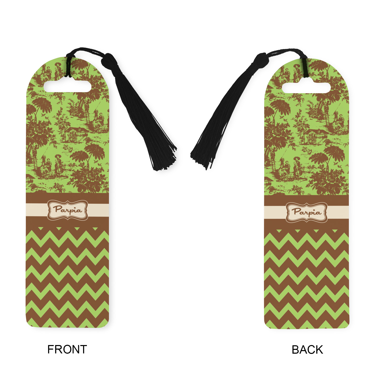 Made from a durable, flexible plastic, these bookmarks are printed with your custom design on them. With the tassel on them they make it easy to find your page in your book. These are a rectangular shape 7 1/4 inches tall with a rounded top and are approximately 2 1/4 inches wide.