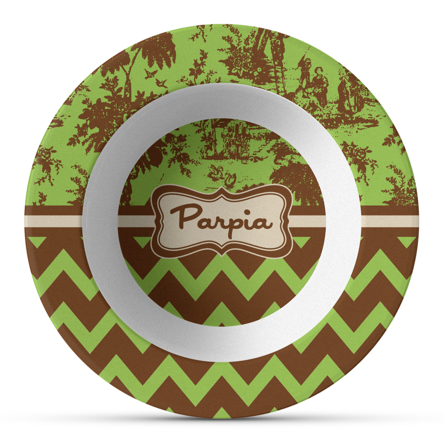 Old world toile just got dressed up. Toile has been around forever but we have taken a centuries old design and brought it to the present and beyond. We took the traditional toile design and modernized it by using brown and green. The toile pattern on top is created in brown which pops on a backdrop of green. On the bottom we have used the very modern chevron pattern in the same green and brown.