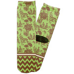 Old world toile just got dressed up. Toile has been around forever but we have taken a centuries old design and brought it to the present and beyond. We took the traditional toile design and modernized it by using brown and green. The toile pattern on top is created in brown which pops on a backdrop of green. On the bottom we have used the very modern chevron pattern in the same green and brown.