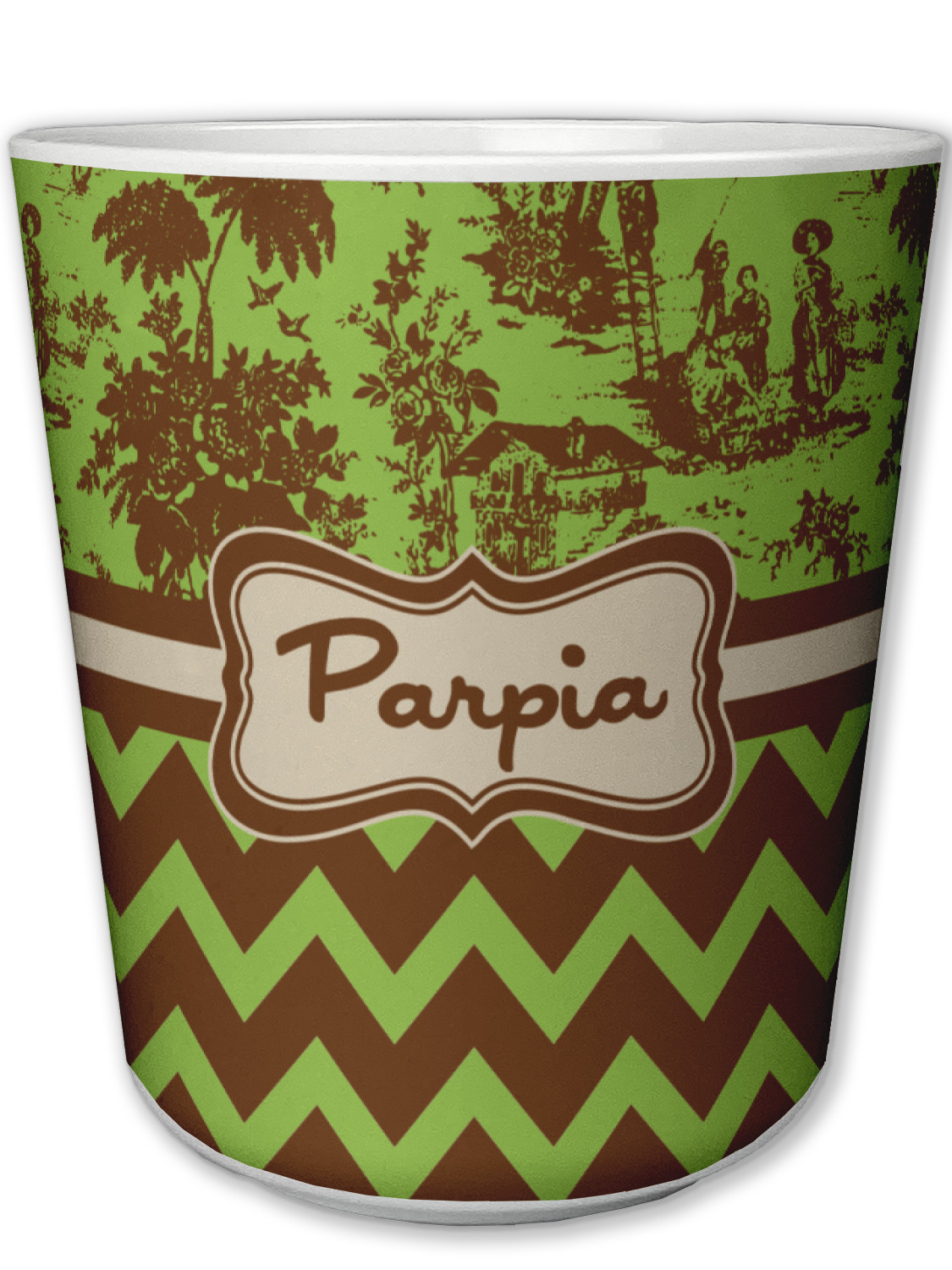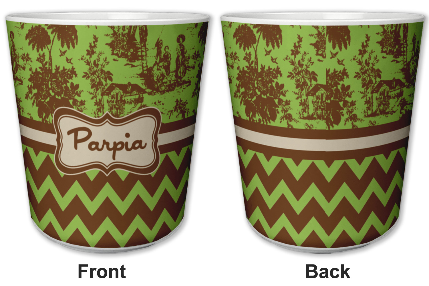 Old world toile just got dressed up. Toile has been around forever but we have taken a centuries old design and brought it to the present and beyond. We took the traditional toile design and modernized it by using brown and green. The toile pattern on top is created in brown which pops on a backdrop of green. On the bottom we have used the very modern chevron pattern in the same green and brown.