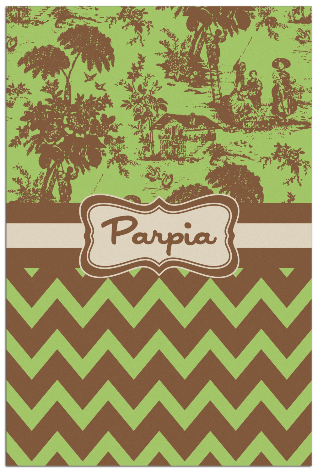 Old world toile just got dressed up. Toile has been around forever but we have taken a centuries old design and brought it to the present and beyond. We took the traditional toile design and modernized it by using brown and green. The toile pattern on top is created in brown which pops on a backdrop of green. On the bottom we have used the very modern chevron pattern in the same green and brown.