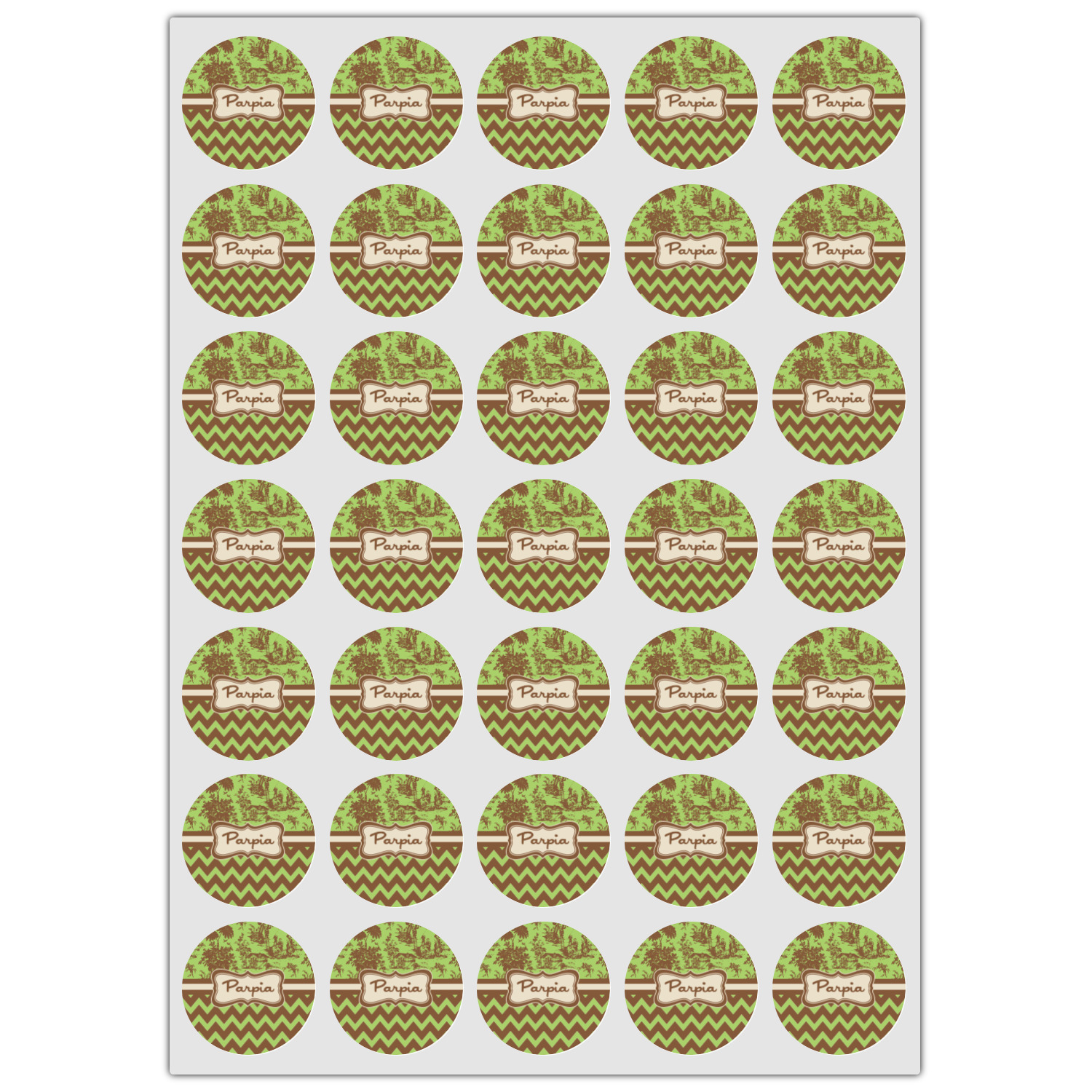 A wide band of cream with an inset of brown trim pulls the design together. A traditional label that is trimmed in double rows of brown and green will provide the focal point for personalization of your choice.