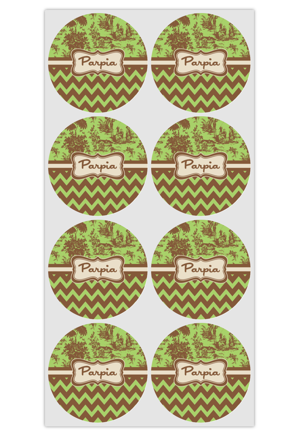 A wide band of cream with an inset of brown trim pulls the design together. A traditional label that is trimmed in double rows of brown and green will provide the focal point for personalization of your choice.
