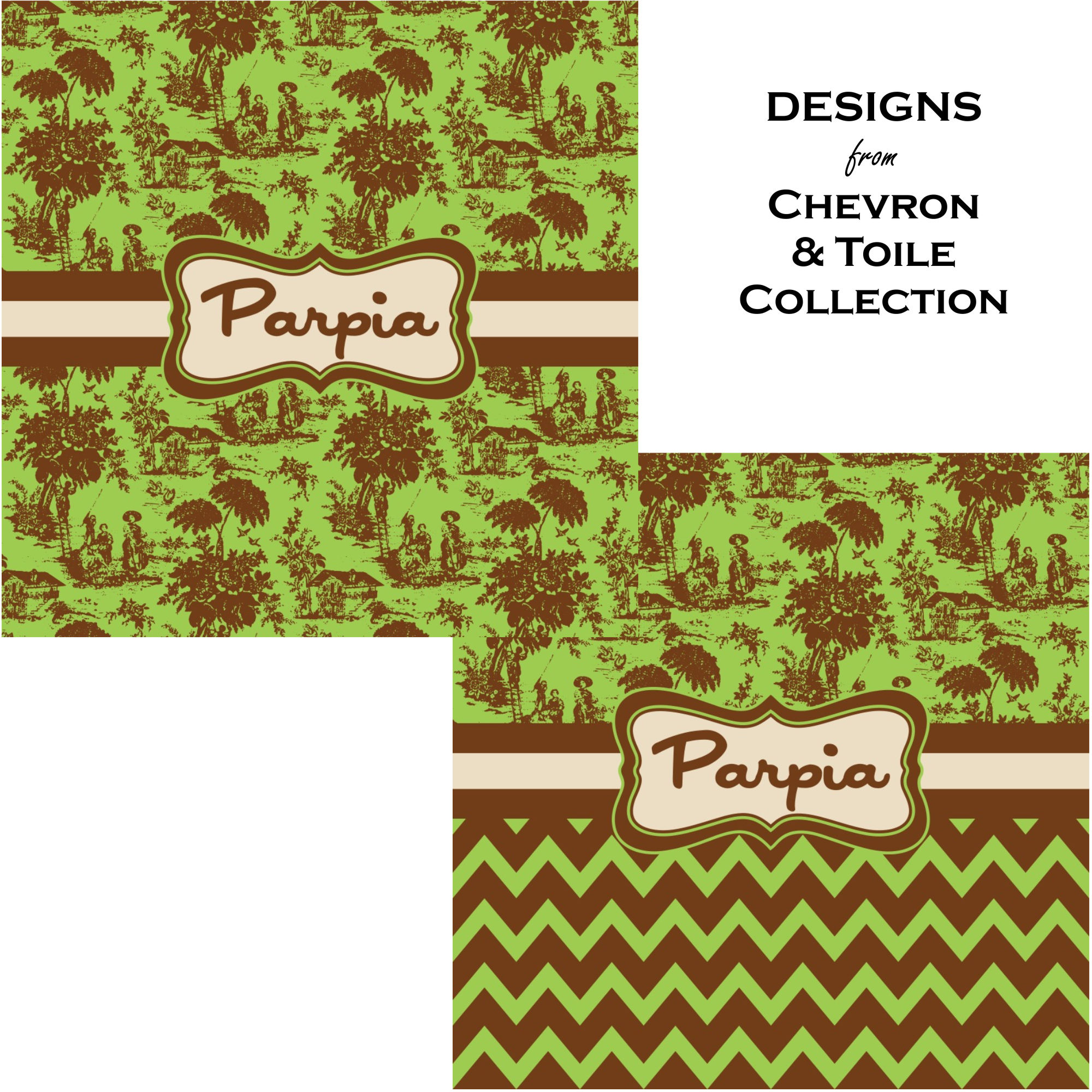 Old world toile just got dressed up. Toile has been around forever but we have taken a centuries old design and brought it to the present and beyond. We took the traditional toile design and modernized it by using brown and green. The toile pattern on top is created in brown which pops on a backdrop of green. On the bottom we have used the very modern chevron pattern in the same green and brown.