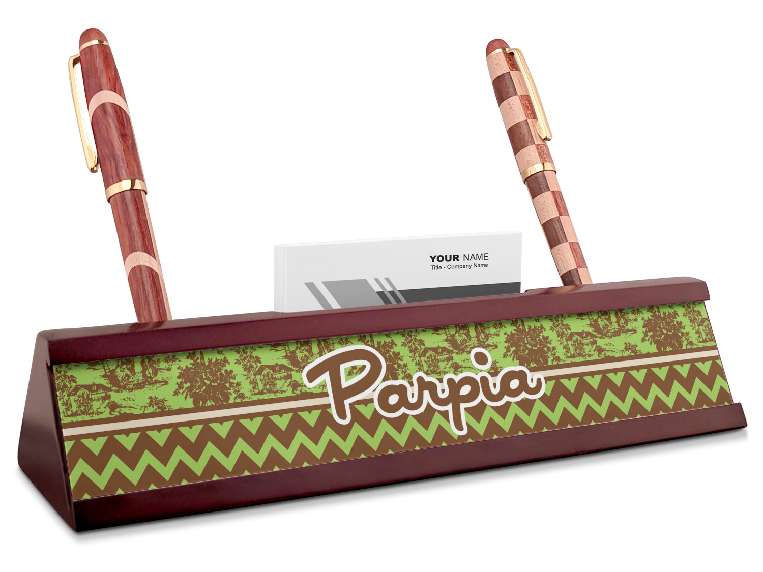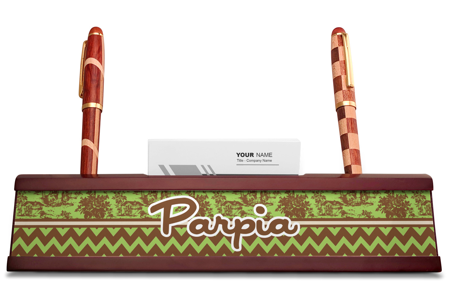 Your desk name plates are crafted from a high-quality, dark-cherry mahogany. At approximately 9.5 by 1.875 by 2.5 inches, this name plaque will fit perfectly, front and center, on your desk. Your customization spans across the entire face of the nameplate. Behind the nameplate lies a skinny slot that can fit approximately 15, traditionally-sized, business cards. You can also store your writing utensils on either side of this custom desk name plate.
