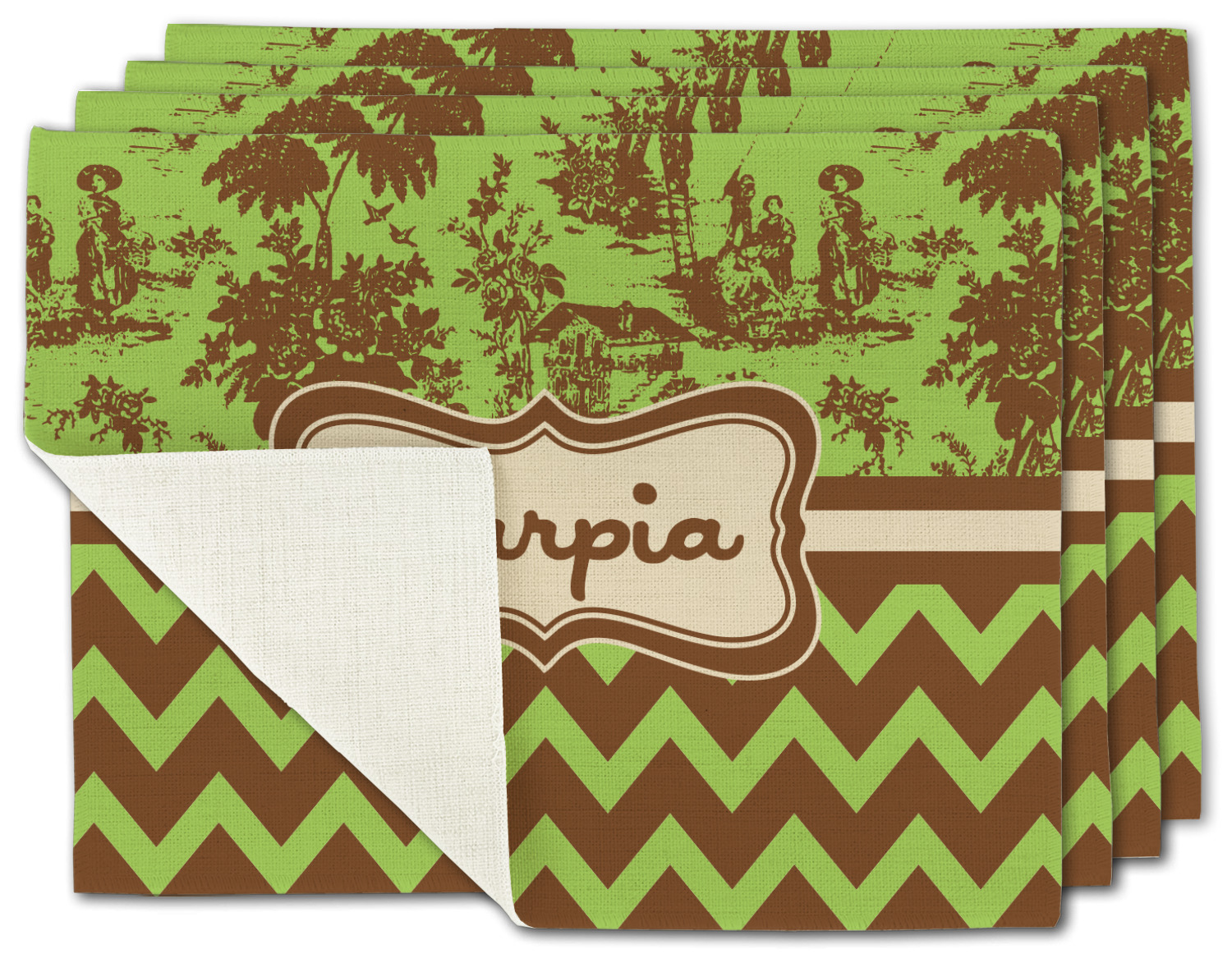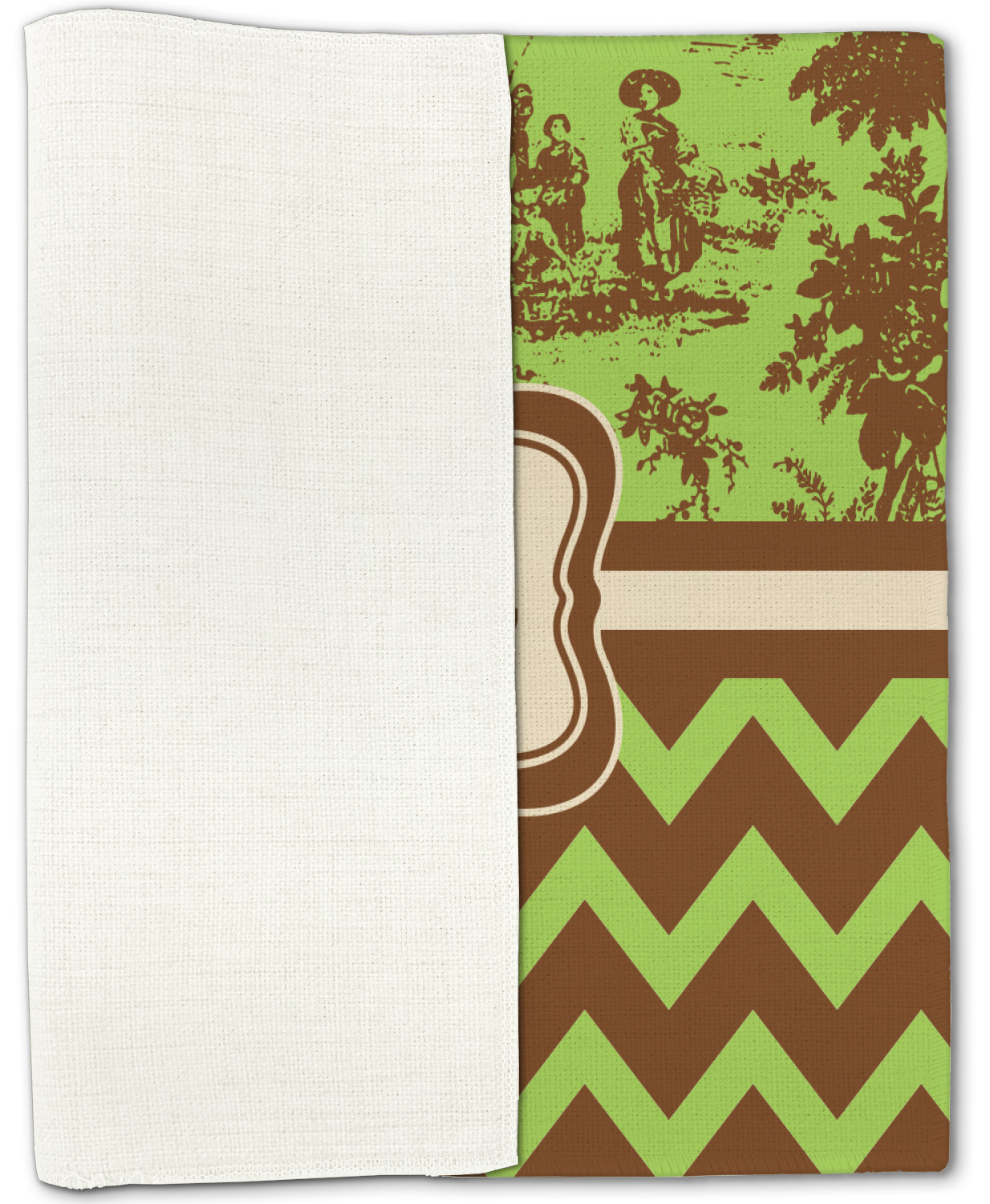 Old world toile just got dressed up. Toile has been around forever but we have taken a centuries old design and brought it to the present and beyond. We took the traditional toile design and modernized it by using brown and green. The toile pattern on top is created in brown which pops on a backdrop of green. On the bottom we have used the very modern chevron pattern in the same green and brown.