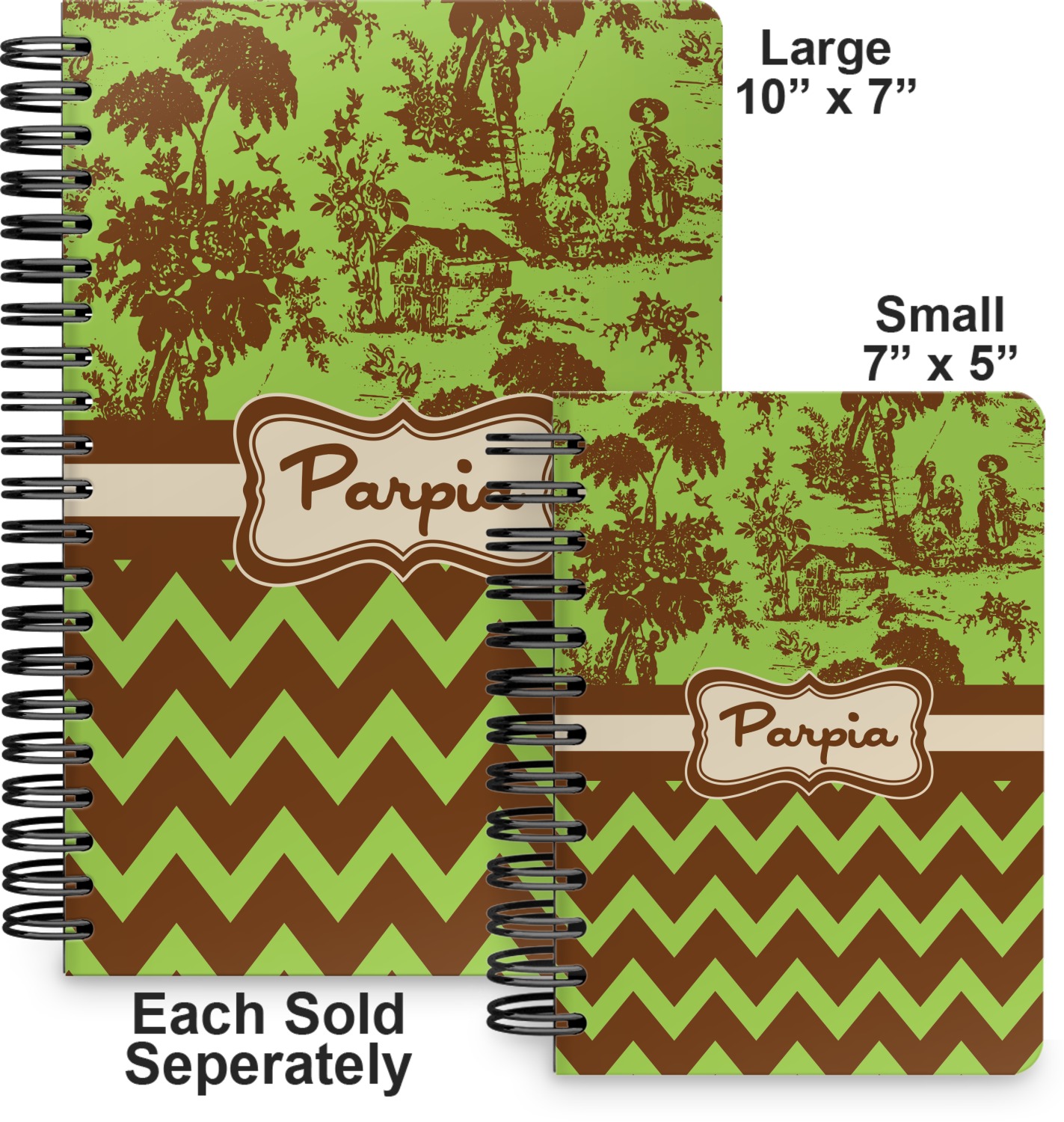 This spiral journal is available in two sizes. The first size is more suitable for a tote or purse and measures at 7" x 5". The second option is a bit larger, at 10" x 7", and is a better fit for a briefcase or backpack.