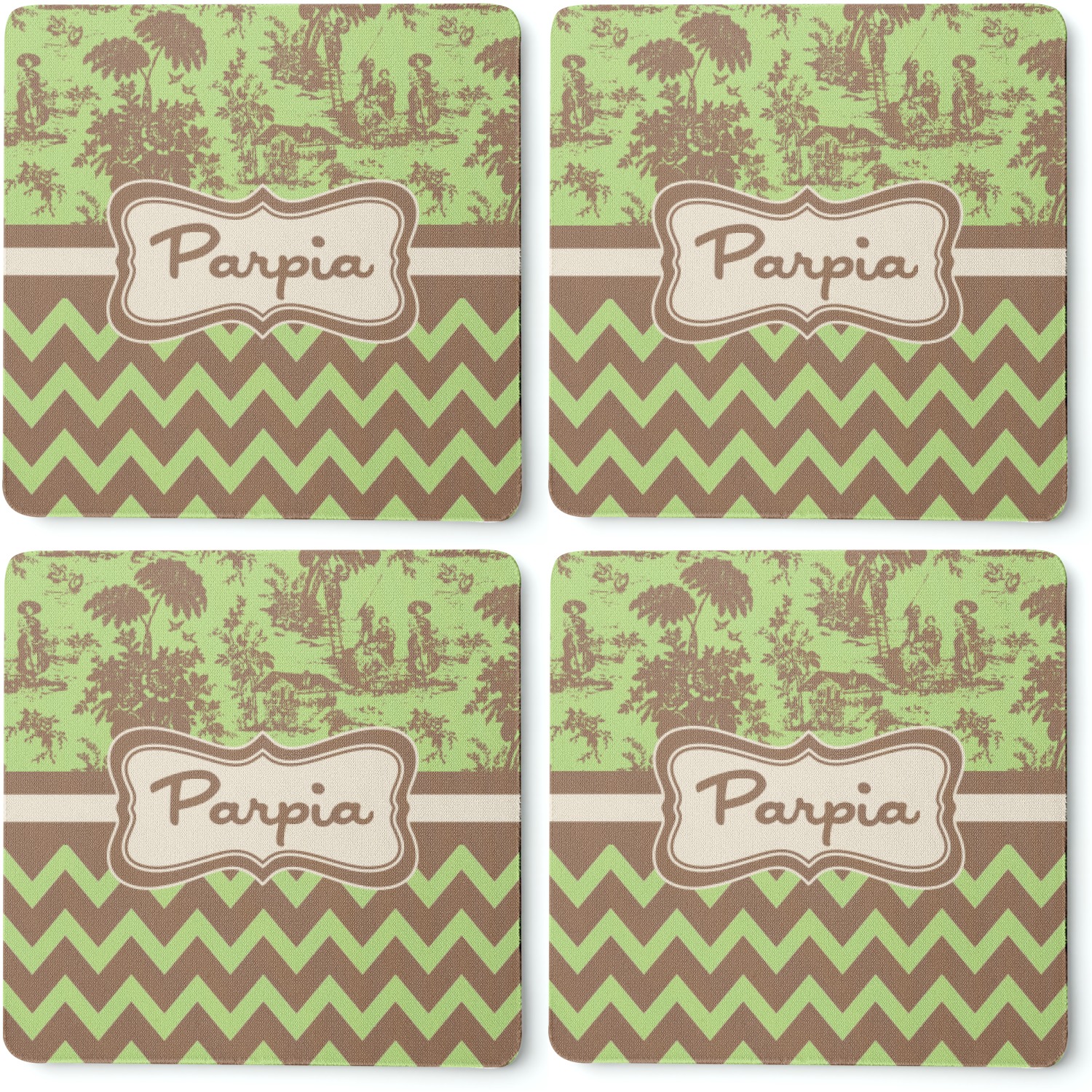 Old world toile just got dressed up. Toile has been around forever but we have taken a centuries old design and brought it to the present and beyond. We took the traditional toile design and modernized it by using brown and green. The toile pattern on top is created in brown which pops on a backdrop of green. On the bottom we have used the very modern chevron pattern in the same green and brown.