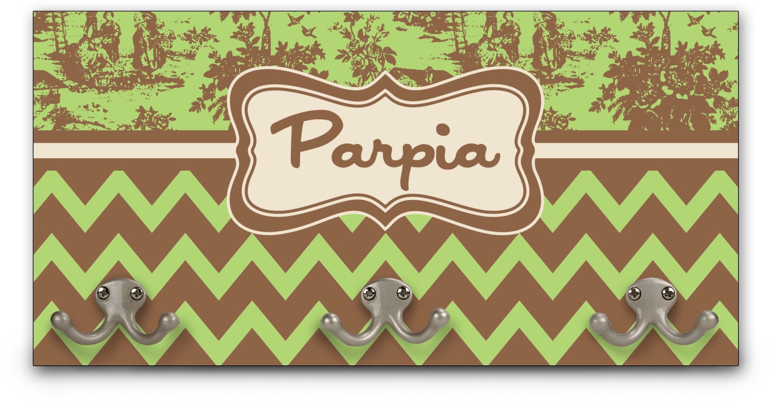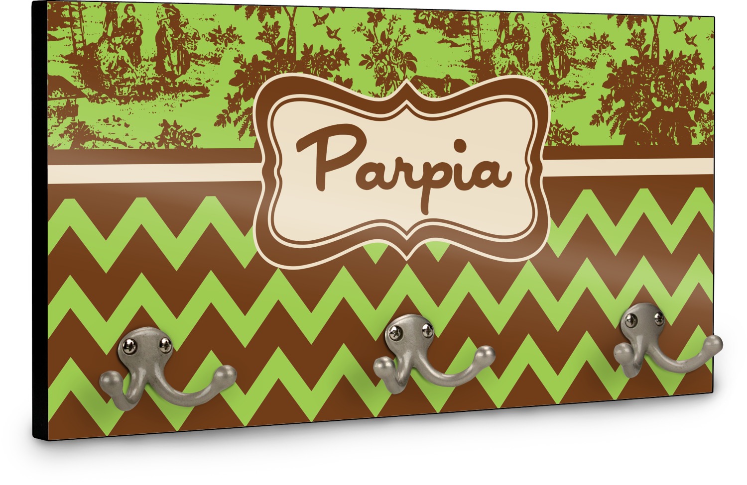 This coat rack is the perfect way to add some personality to your wall or entryway. The board is made of a strong maple that is approximately 16" x 8". The three 2-prong hooks are a sturdy metal that have three screws attaching them to the board. Your design is printed right onto the front of the board while the back and sides are a simple black.