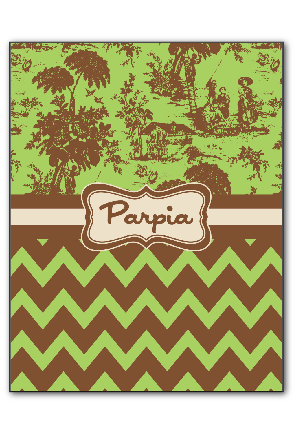 Old world toile just got dressed up. Toile has been around forever but we have taken a centuries old design and brought it to the present and beyond. We took the traditional toile design and modernized it by using brown and green. The toile pattern on top is created in brown which pops on a backdrop of green. On the bottom we have used the very modern chevron pattern in the same green and brown.