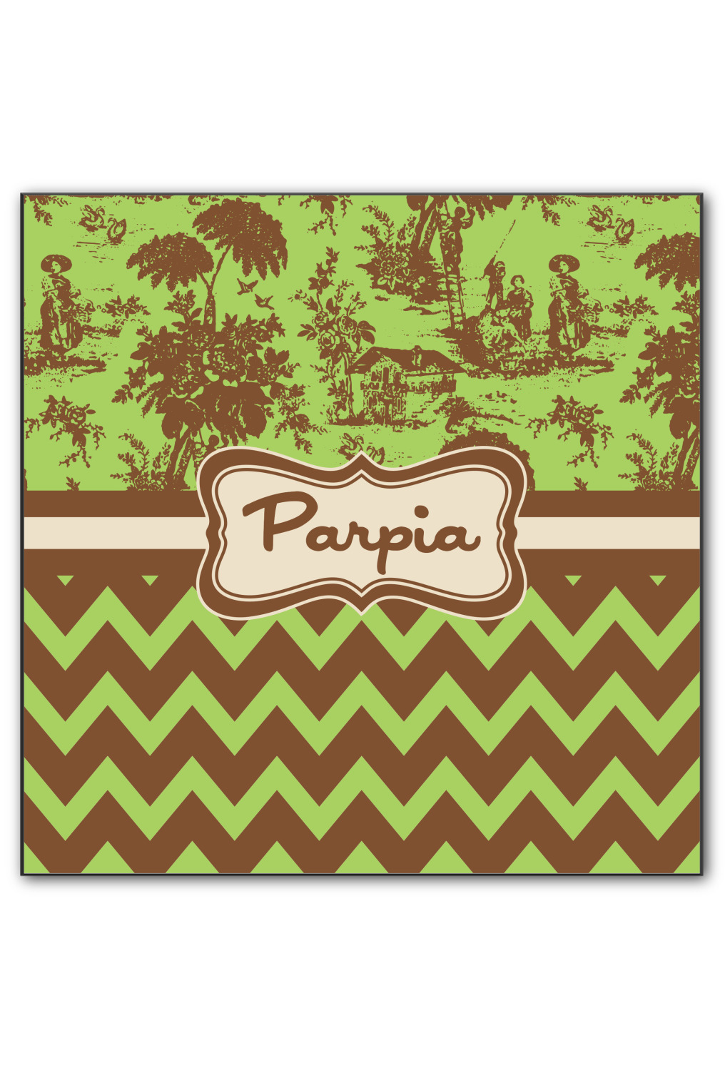 Old world toile just got dressed up. Toile has been around forever but we have taken a centuries old design and brought it to the present and beyond. We took the traditional toile design and modernized it by using brown and green. The toile pattern on top is created in brown which pops on a backdrop of green. On the bottom we have used the very modern chevron pattern in the same green and brown.