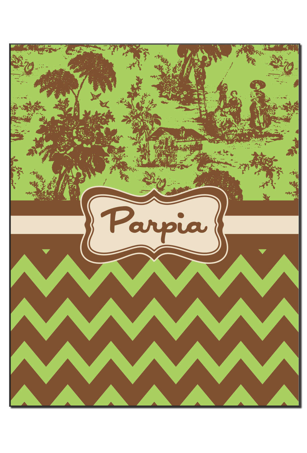 Old world toile just got dressed up. Toile has been around forever but we have taken a centuries old design and brought it to the present and beyond. We took the traditional toile design and modernized it by using brown and green. The toile pattern on top is created in brown which pops on a backdrop of green. On the bottom we have used the very modern chevron pattern in the same green and brown.