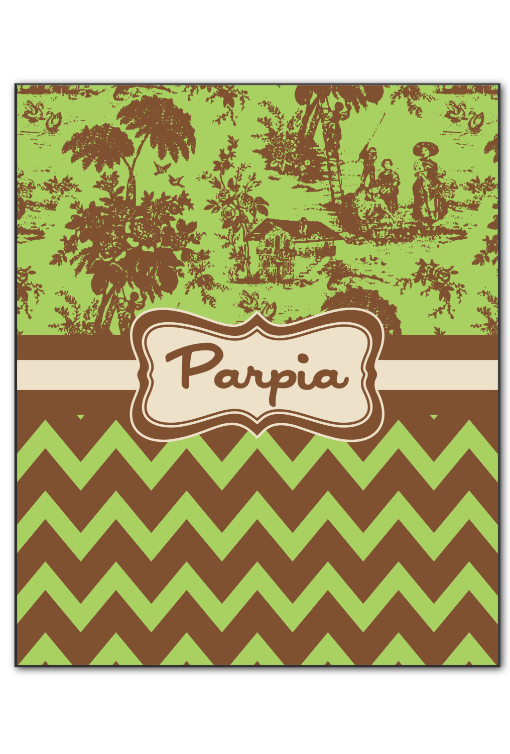 Old world toile just got dressed up. Toile has been around forever but we have taken a centuries old design and brought it to the present and beyond. We took the traditional toile design and modernized it by using brown and green. The toile pattern on top is created in brown which pops on a backdrop of green. On the bottom we have used the very modern chevron pattern in the same green and brown.
