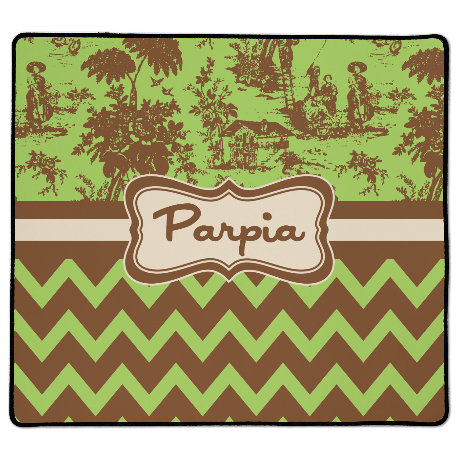 Old world toile just got dressed up. Toile has been around forever but we have taken a centuries old design and brought it to the present and beyond. We took the traditional toile design and modernized it by using brown and green. The toile pattern on top is created in brown which pops on a backdrop of green. On the bottom we have used the very modern chevron pattern in the same green and brown.