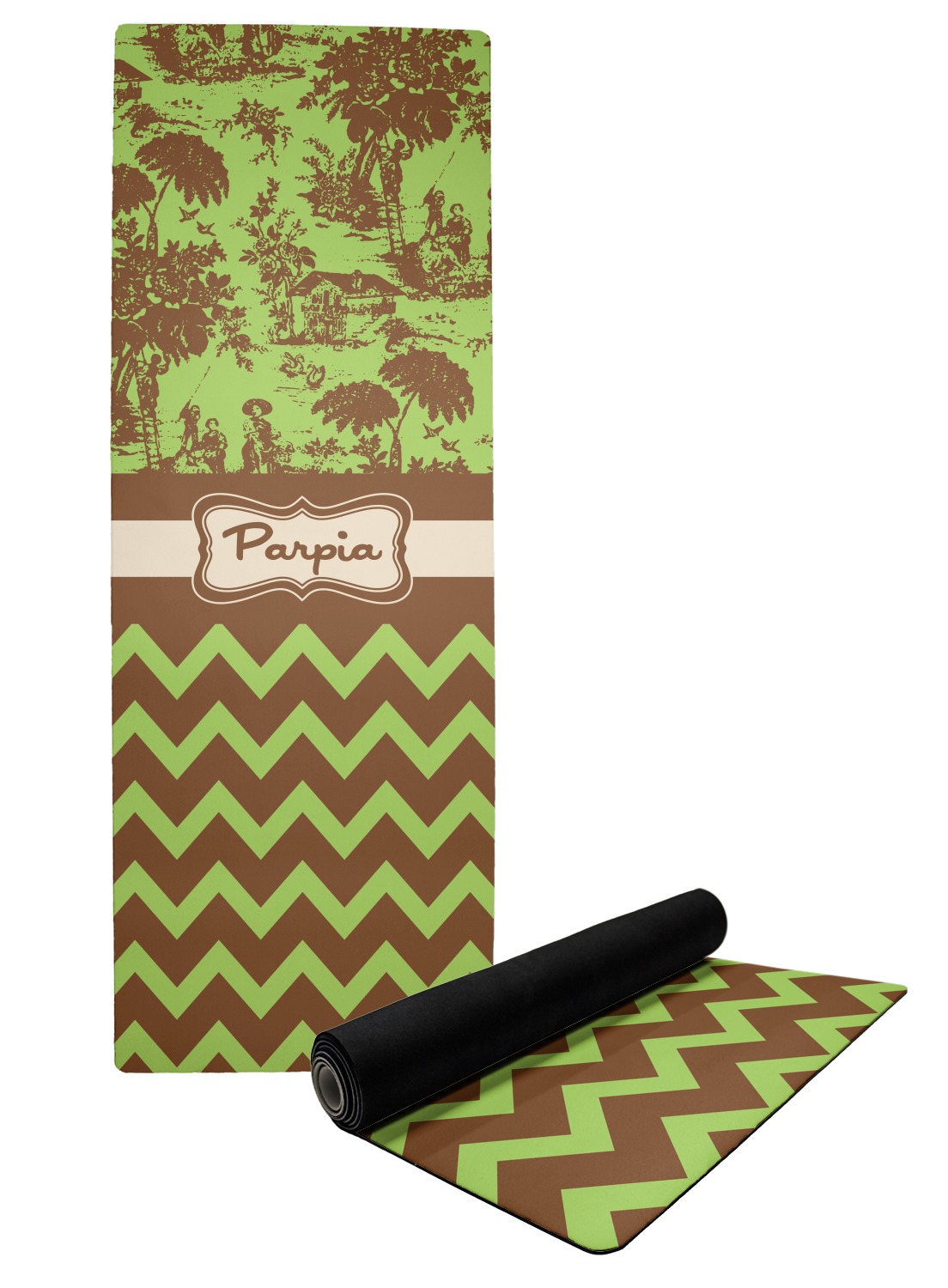 Old world toile just got dressed up. Toile has been around forever but we have taken a centuries old design and brought it to the present and beyond. We took the traditional toile design and modernized it by using brown and green. The toile pattern on top is created in brown which pops on a backdrop of green. On the bottom we have used the very modern chevron pattern in the same green and brown.