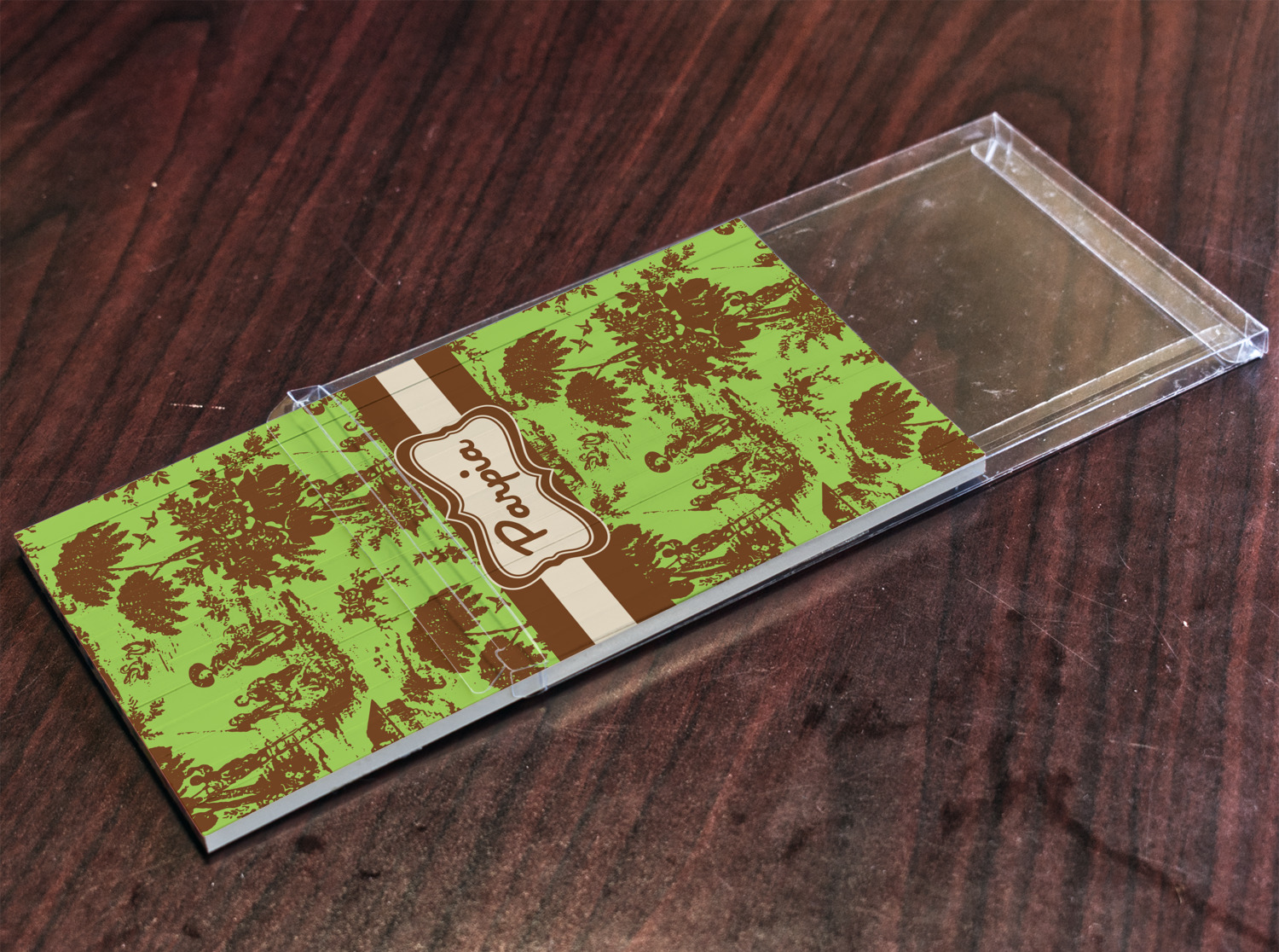 A wide band of cream with an inset of brown trim pulls the design together. A traditional label that is trimmed in double rows of brown and green will provide the focal point for personalization of your choice.