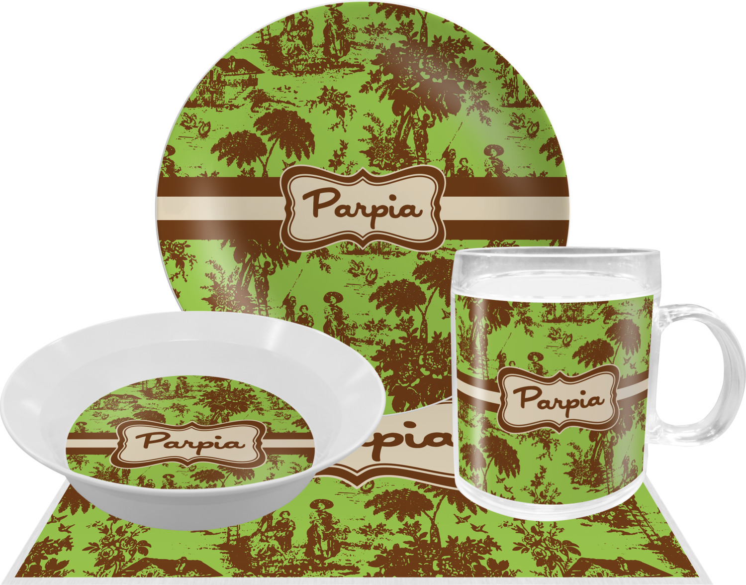 Old world toile just got dressed up. Toile has been around forever but we have taken a centuries old design and brought it to the present and beyond. We took the traditional toile design and modernized it by using brown and green. The toile pattern is created in brown which pops on a backdrop of green.