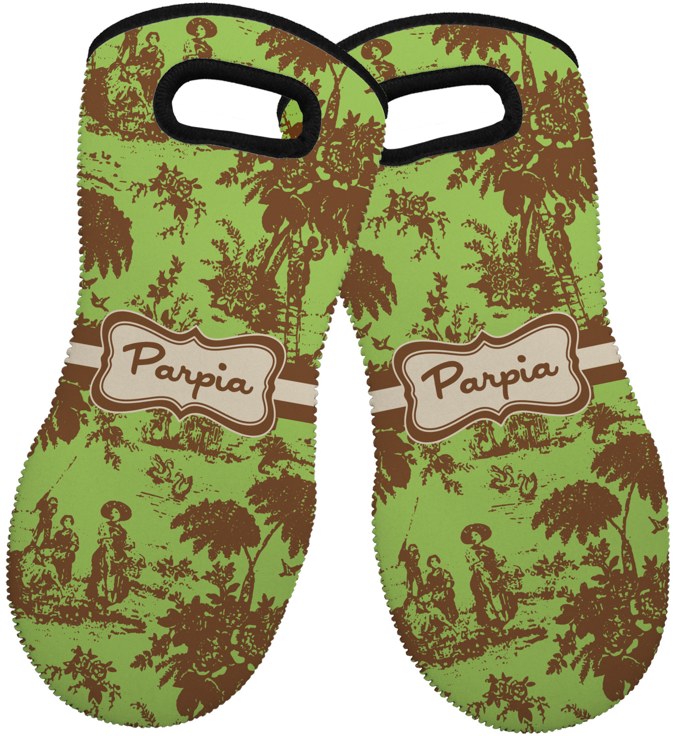 These heat resistant gloves are made entirely of a durable neoprene; the front features a softer texture, while the palm's side has a textured surface, meant to handle heat up to 500 degrees Fahrenheit. Thick, heavy duty stitching connects the two sides. A small, oval cutout appears on the front, and can be used to hang and store the mitt. Your personalization appears on the front, and the upper part of the back of the mitt. The style of these oven mitts are suitable for both the right and left hand, depending on your needs. If you need one for each hand, be sure to order two!