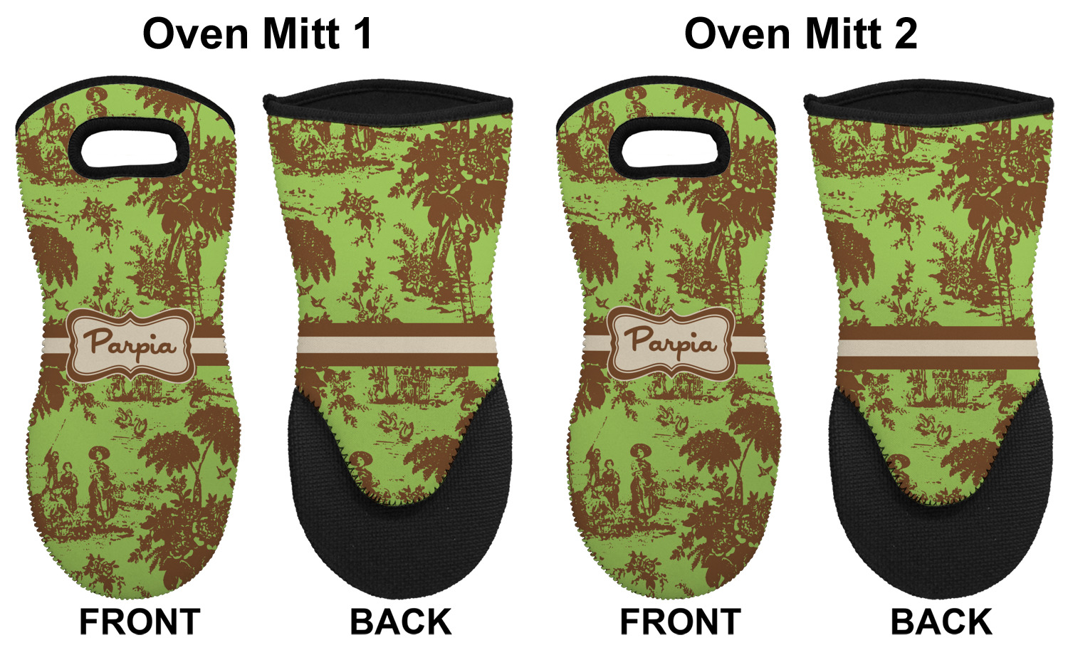 These heat resistant gloves are made entirely of a durable neoprene; the front features a softer texture, while the palm's side has a textured surface, meant to handle heat up to 500 degrees Fahrenheit. Thick, heavy duty stitching connects the two sides. A small, oval cutout appears on the front, and can be used to hang and store the mitt. Your personalization appears on the front, and the upper part of the back of the mitt. The style of these oven mitts are suitable for both the right and left hand, depending on your needs. If you need one for each hand, be sure to order two!