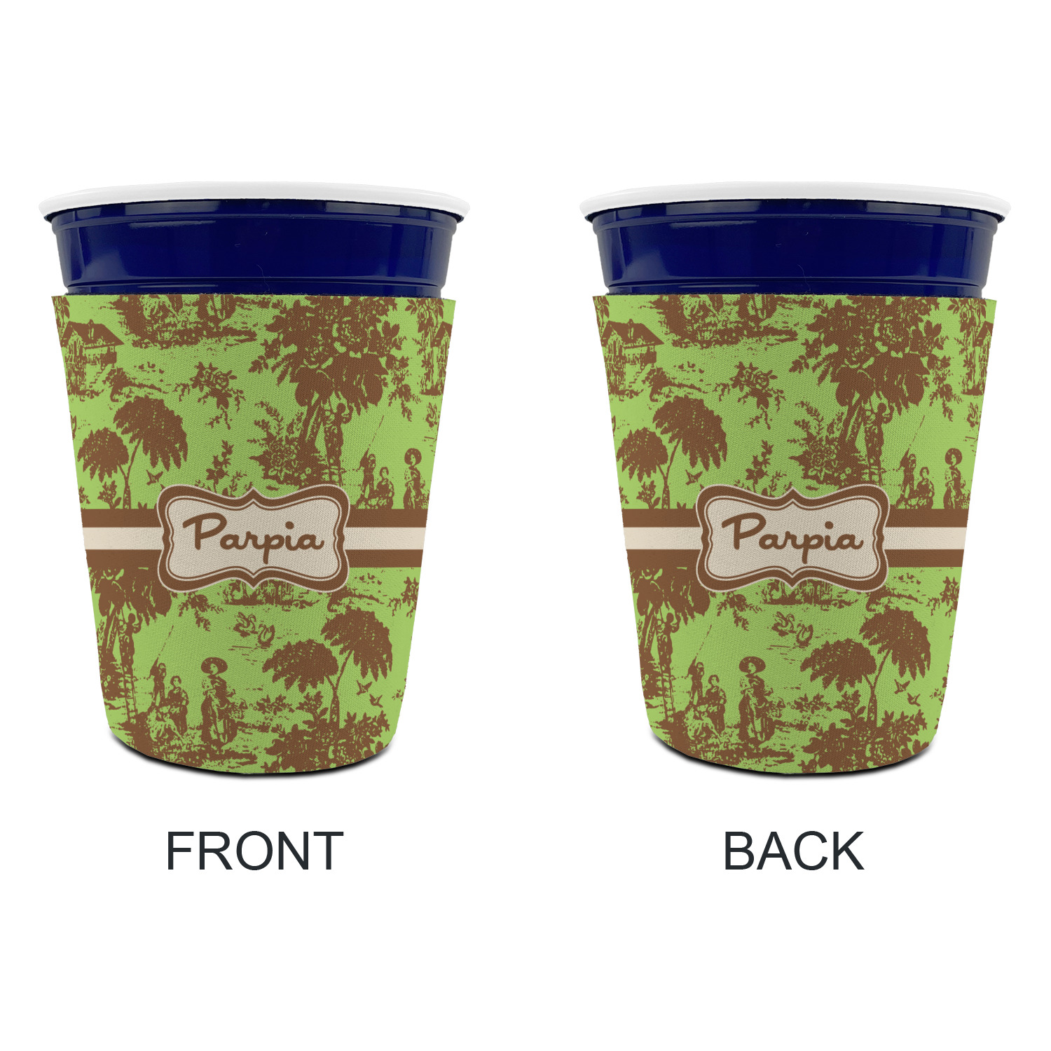 Made from neoprene with a polyester outer fabric and sewn seams, these premium quality party cup sleeves are very durable and will hold up to heavy use. They are available in 2 styles - with a bottom or just a sleeve to go around the outside of the tapered cup. The sleeve covers are about 4" tall and cover about 90% of the classic 16 oz. Solo cup.