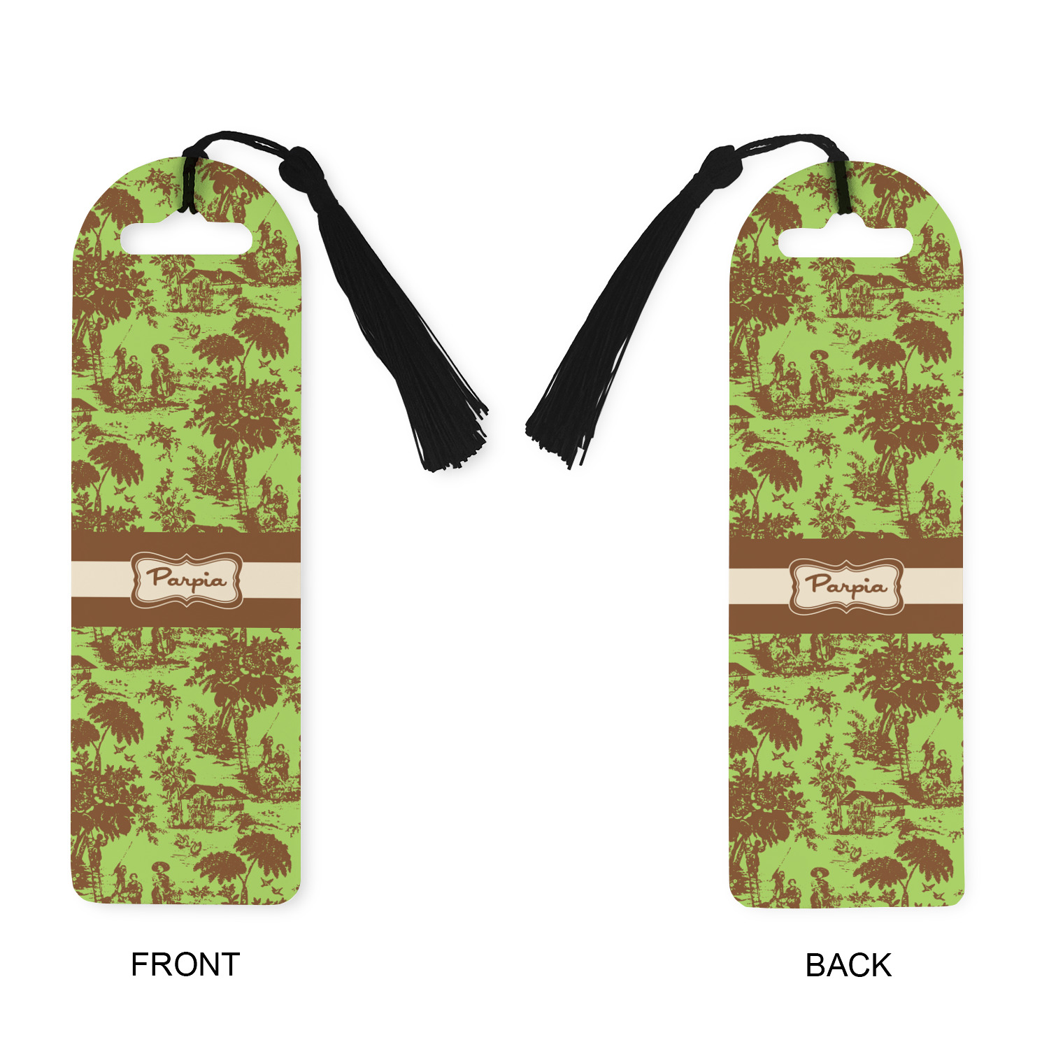 Made from a durable, flexible plastic, these bookmarks are printed with your custom design on them. With the tassel on them they make it easy to find your page in your book. These are a rectangular shape 7 1/4 inches tall with a rounded top and are approximately 2 1/4 inches wide.