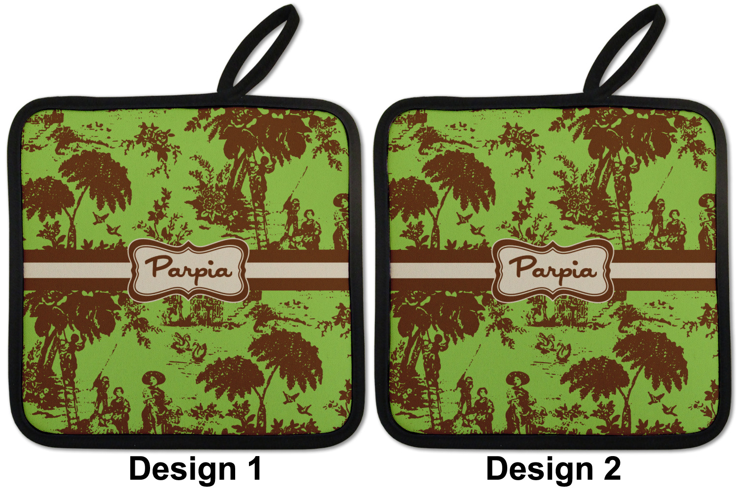 Our personalized pot holders feature a neoprene front that displays your personalization in vibrant colors. The backing of the hot pot holder is rubberized; the textured backing allows you to have a great grip when using this custom pot holder. The two materials are joined with a sleek, black trim, and the holder also includes an attached loop for hanging and storage. The pot holder is approximately 8.75 inches by 8.75 inches and 0.25 inches tall, while the fabric loop is 2.5 inches long. You can purchase a kitchen pot holder by itself or as a set of 2. We also offer a set including one pot holder and one oven mitt.