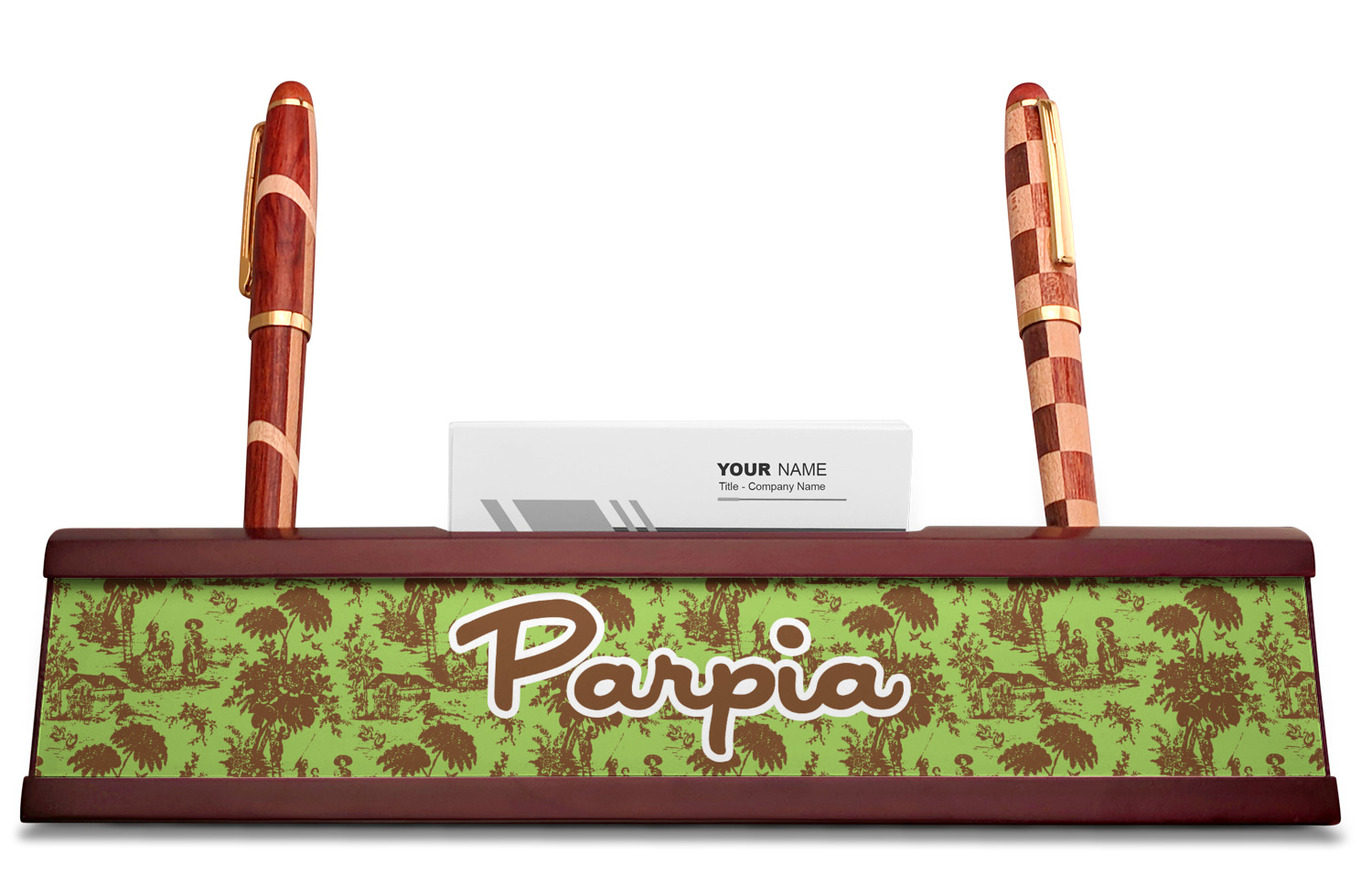 Your desk name plates are crafted from a high-quality, dark-cherry mahogany. At approximately 9.5 by 1.875 by 2.5 inches, this name plaque will fit perfectly, front and center, on your desk. Your customization spans across the entire face of the nameplate. Behind the nameplate lies a skinny slot that can fit approximately 15, traditionally-sized, business cards. You can also store your writing utensils on either side of this custom desk name plate.