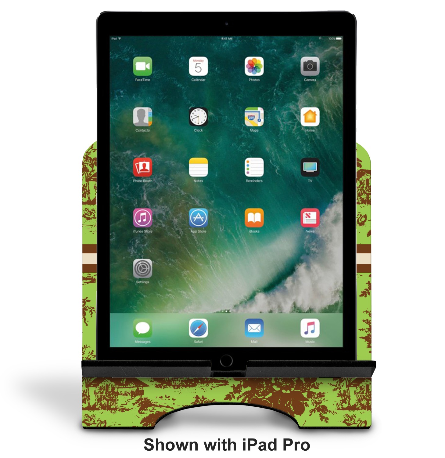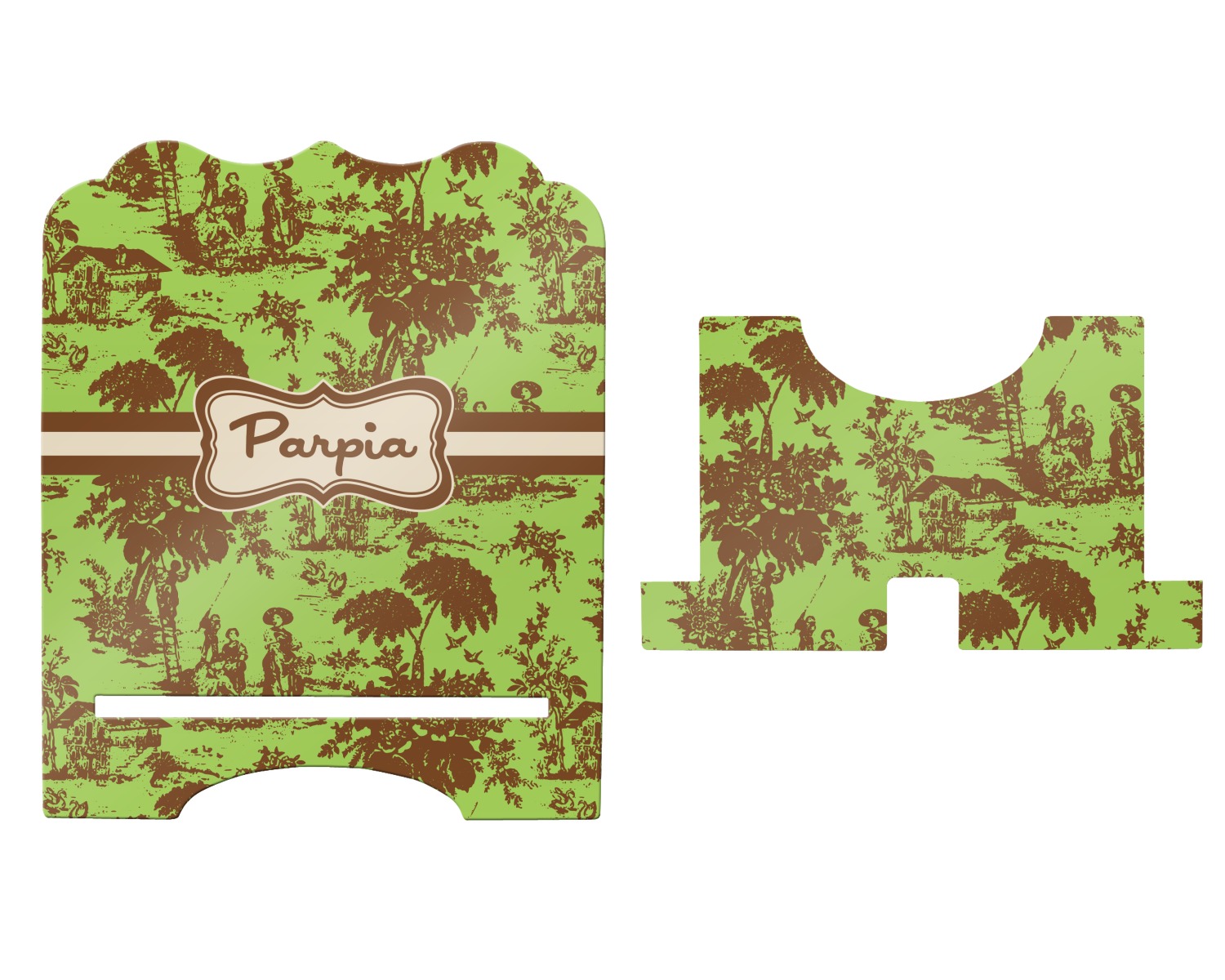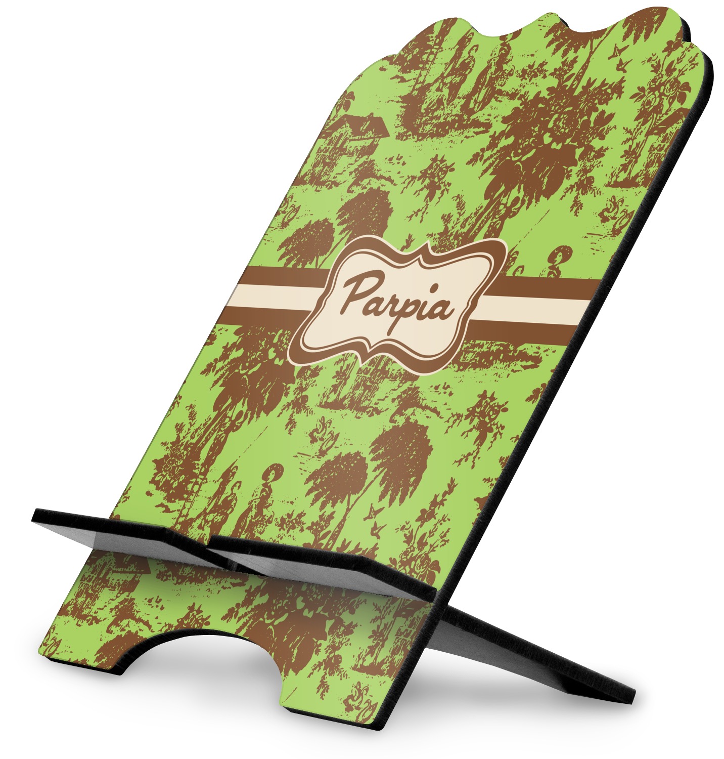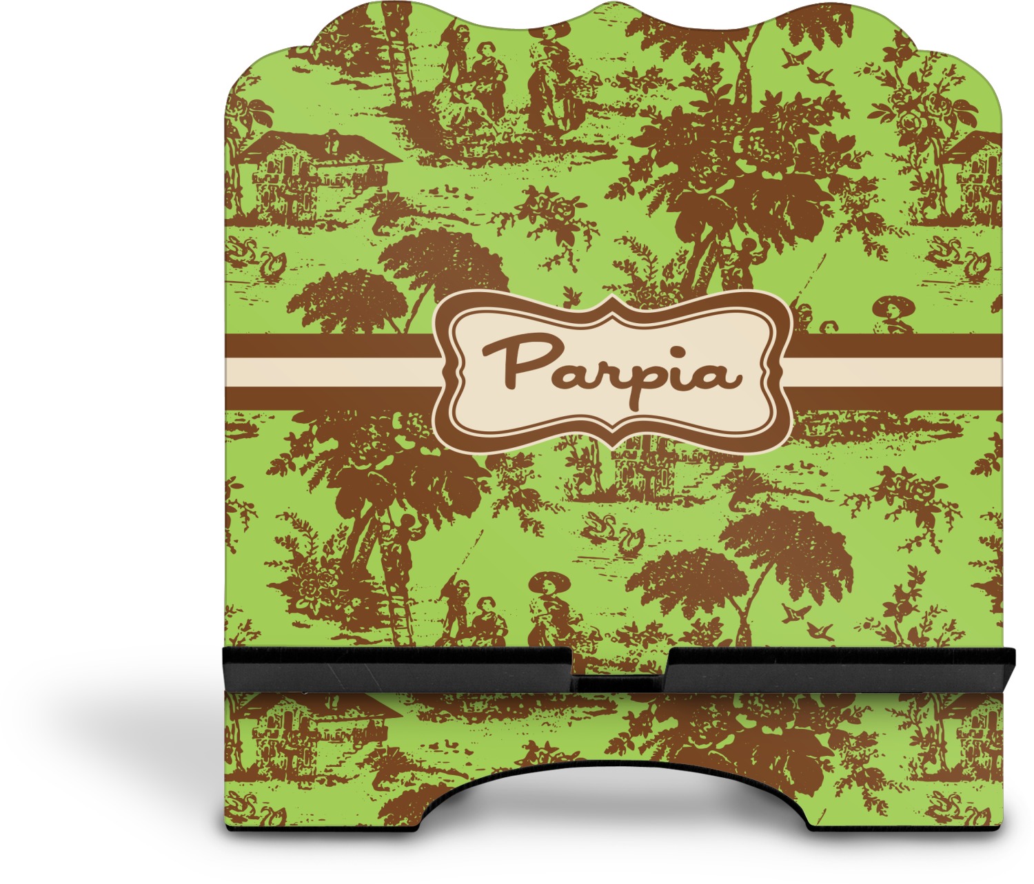 The stand is comprised of two hardboard pieces that fit snugly together and stabilize one another. The bottom part of the iPad stand supports your tablet, and has space for your tablets charger while in use. At 9.25" x 11.5", this tablet mount can support a device between the sizes of the iPad Pro and the iPad Mini 2. The uppermost part of the stand features a decorative, curved edge for a classy, suave appearance. We print your customization atop the face of the stand, in vibrant color. The remaining sides are colored a sleek black.