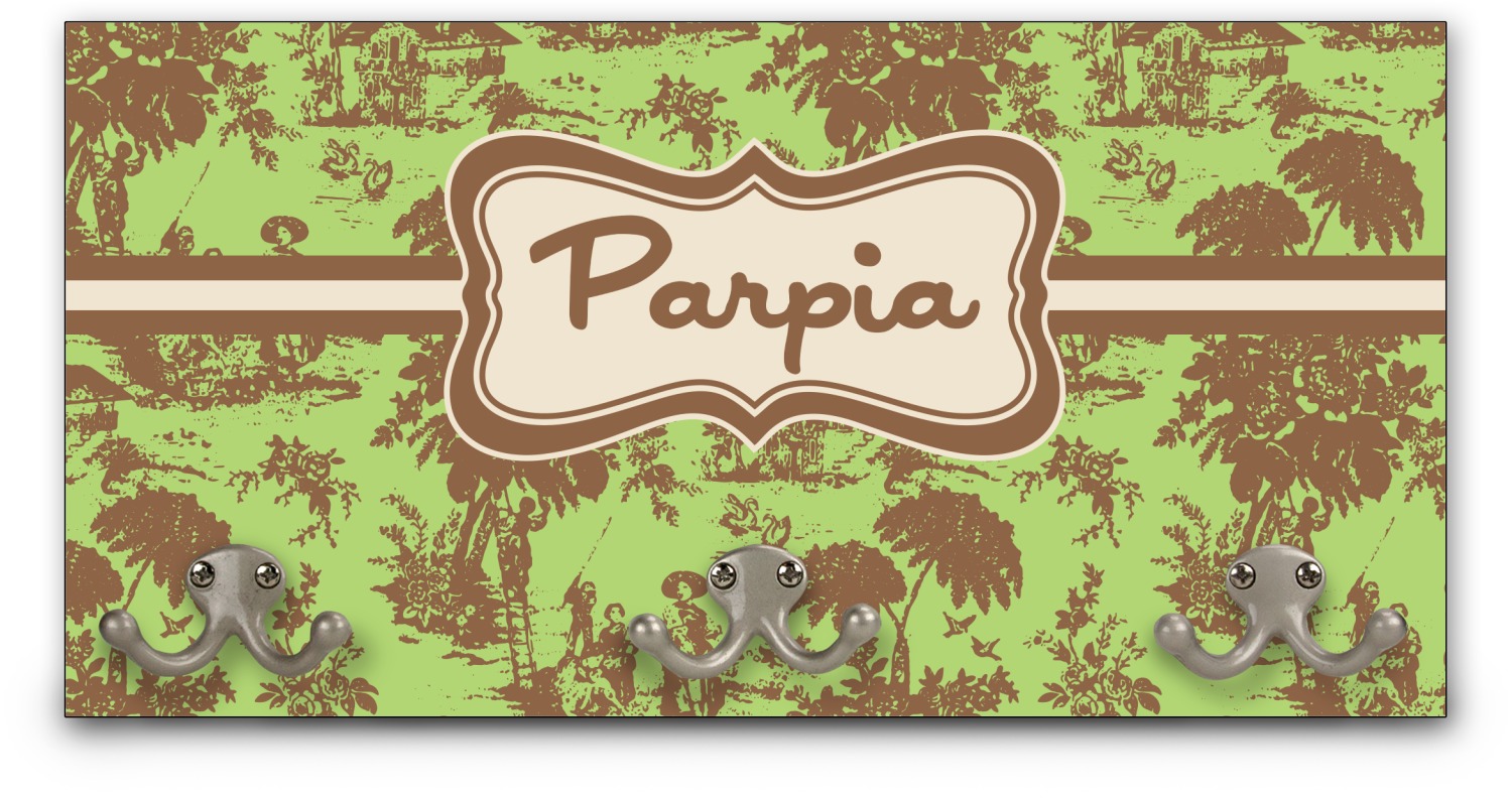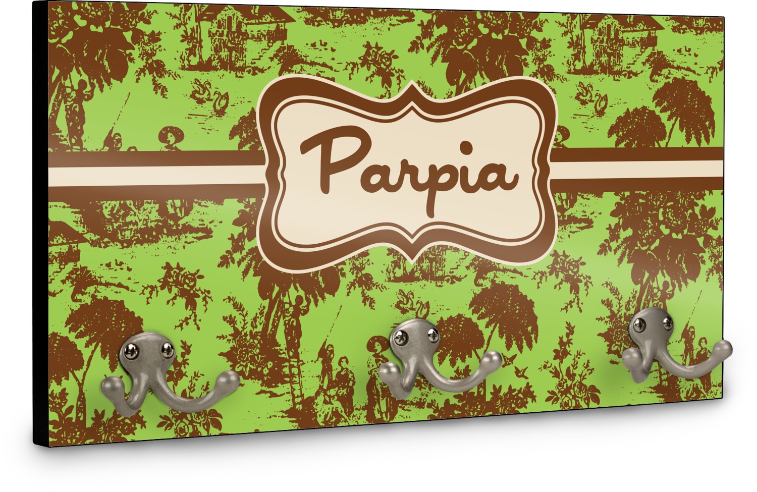 This coat rack is the perfect way to add some personality to your wall or entryway. The board is made of a strong maple that is approximately 16" x 8". The three 2-prong hooks are a sturdy metal that have three screws attaching them to the board. Your design is printed right onto the front of the board while the back and sides are a simple black.