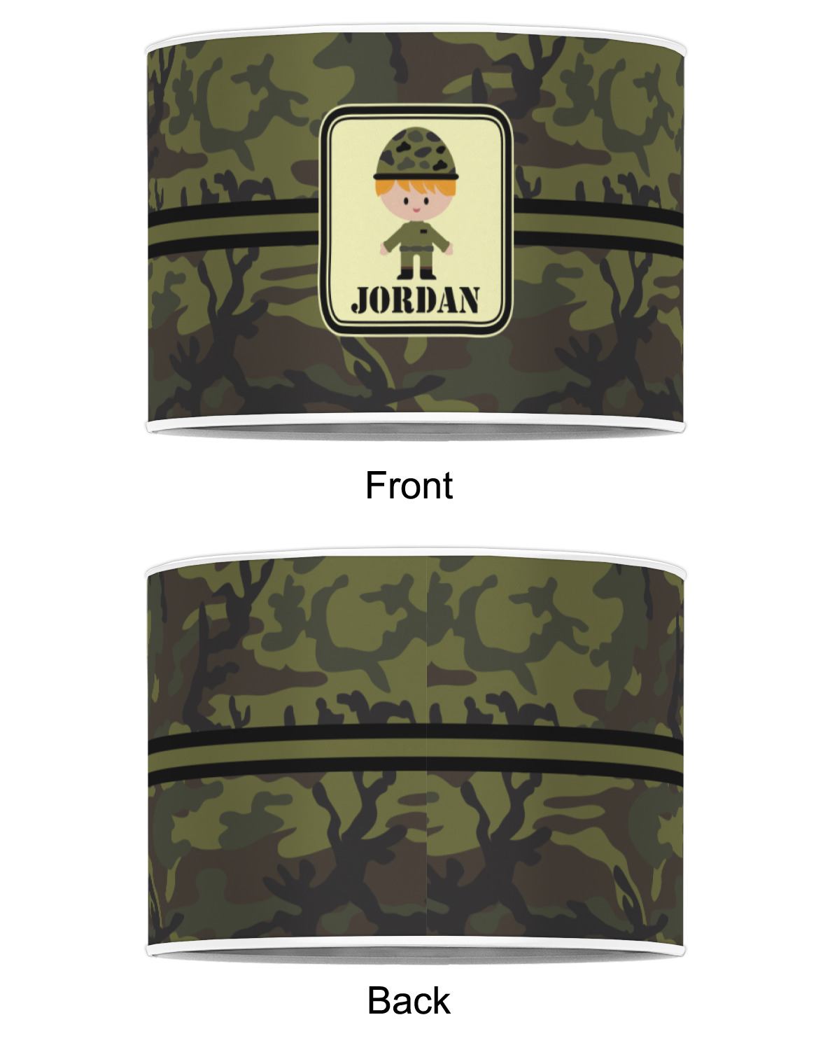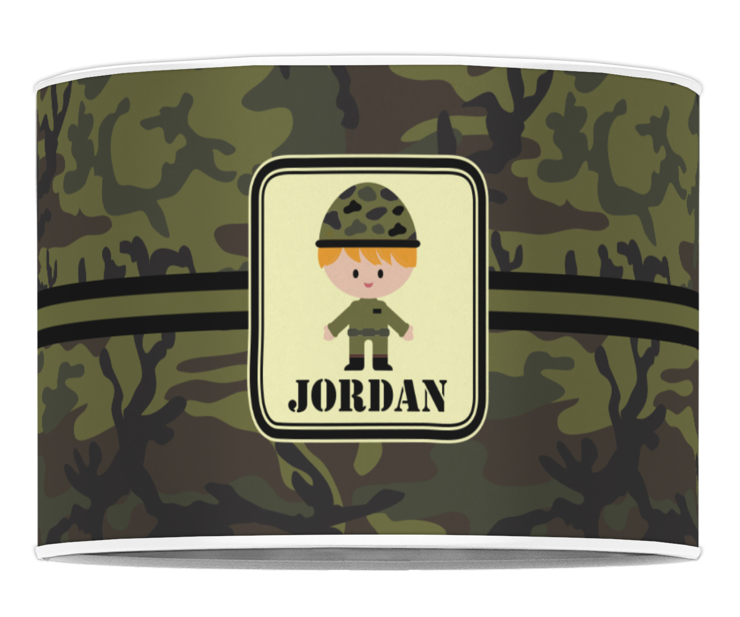 A wide band using coordinating colors runs down the middle of this design. A square label, outlined with camo colors, showcases our little military man with added personalization for the special touch.