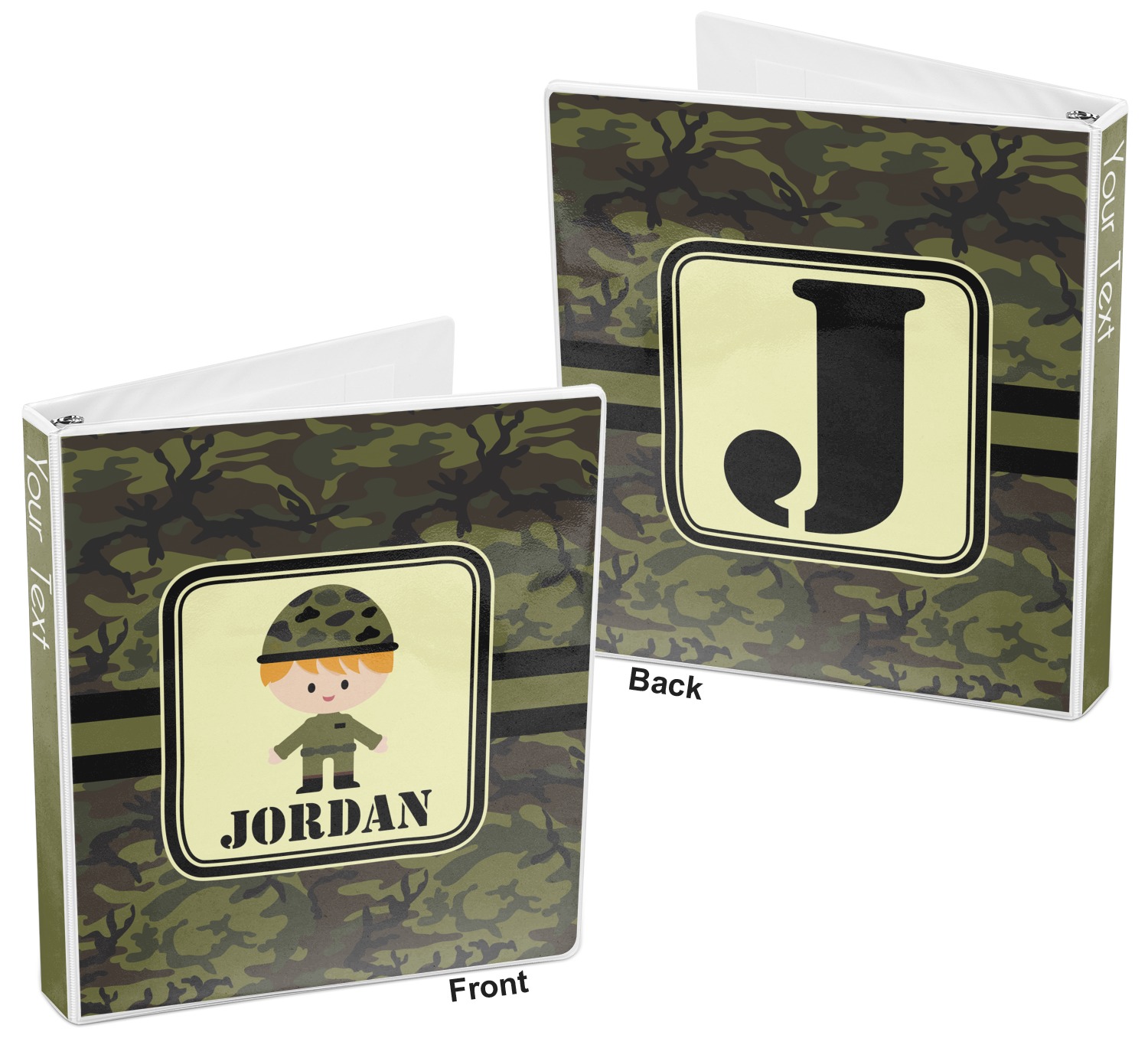 A wide band using coordinating colors runs down the middle of this design. A square label, outlined with camo colors, showcases our little military man with added personalization for the special touch.