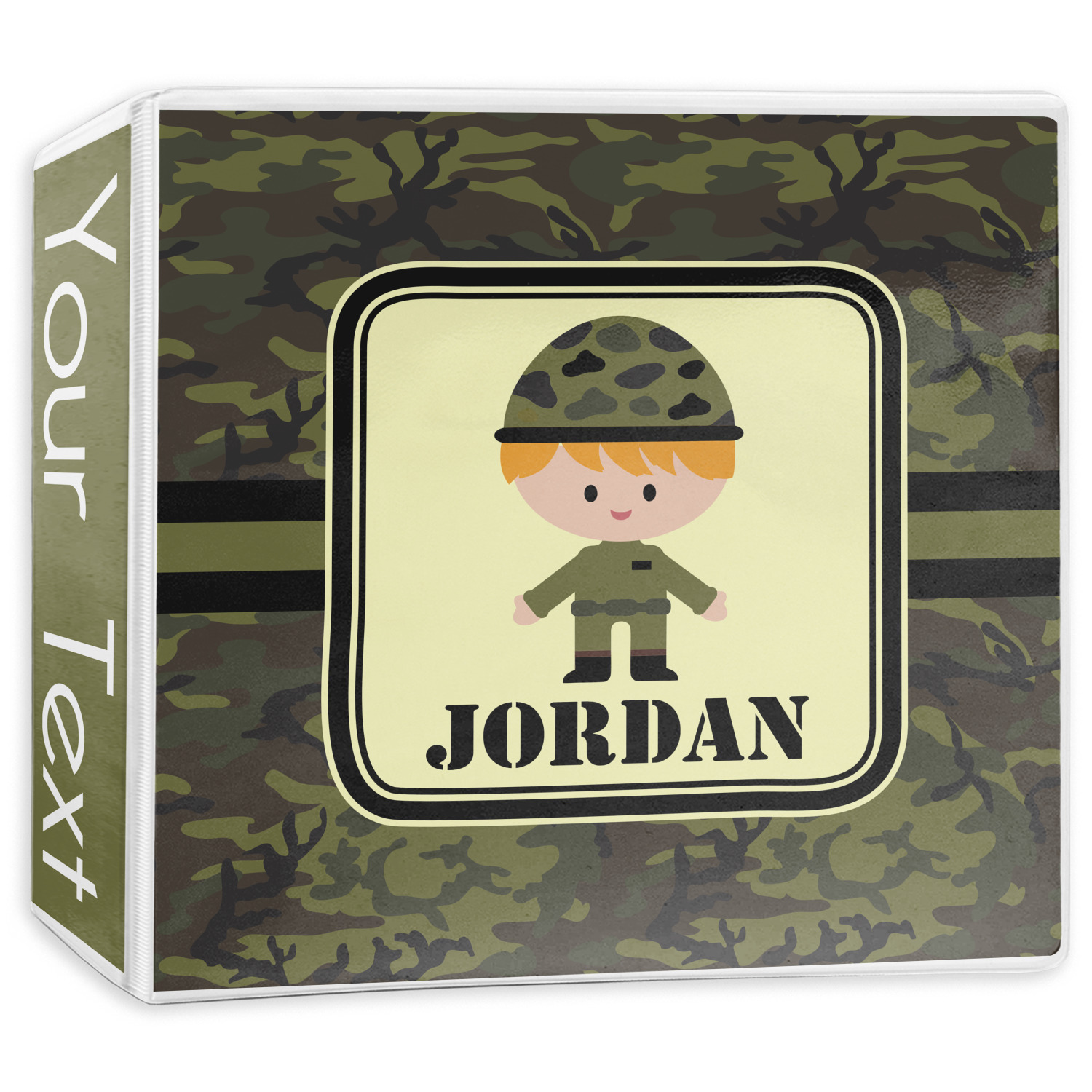 A wide band using coordinating colors runs down the middle of this design. A square label, outlined with camo colors, showcases our little military man with added personalization for the special touch.