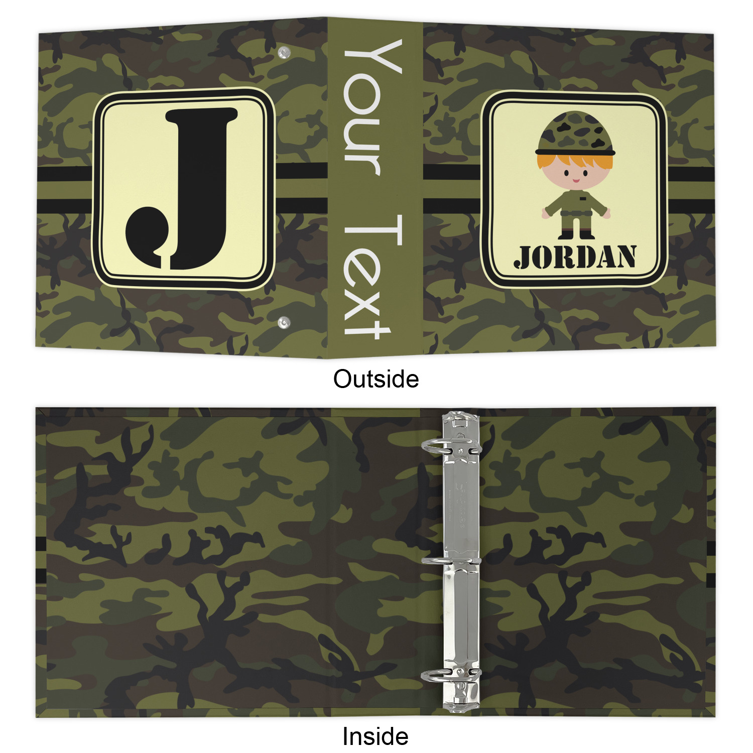 A wide band using coordinating colors runs down the middle of this design. A square label, outlined with camo colors, showcases our little military man with added personalization for the special touch.