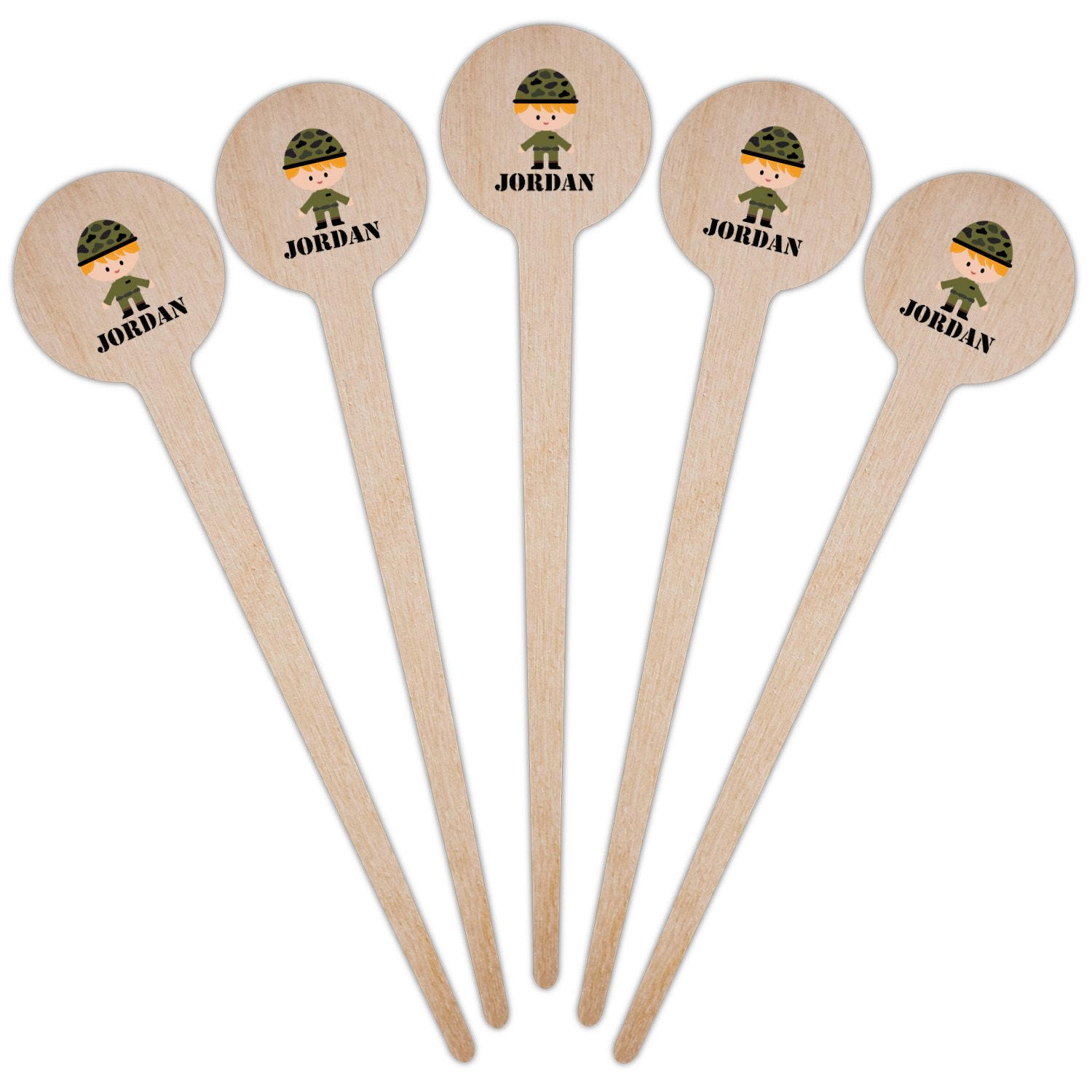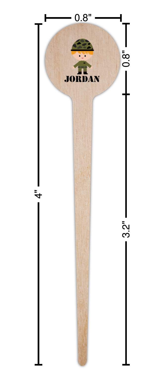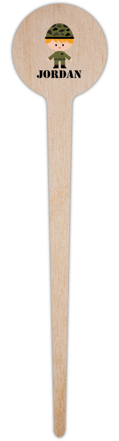 A wide band using coordinating colors runs down the middle of this design. A square label, outlined with camo colors, showcases our little military man with added personalization for the special touch.