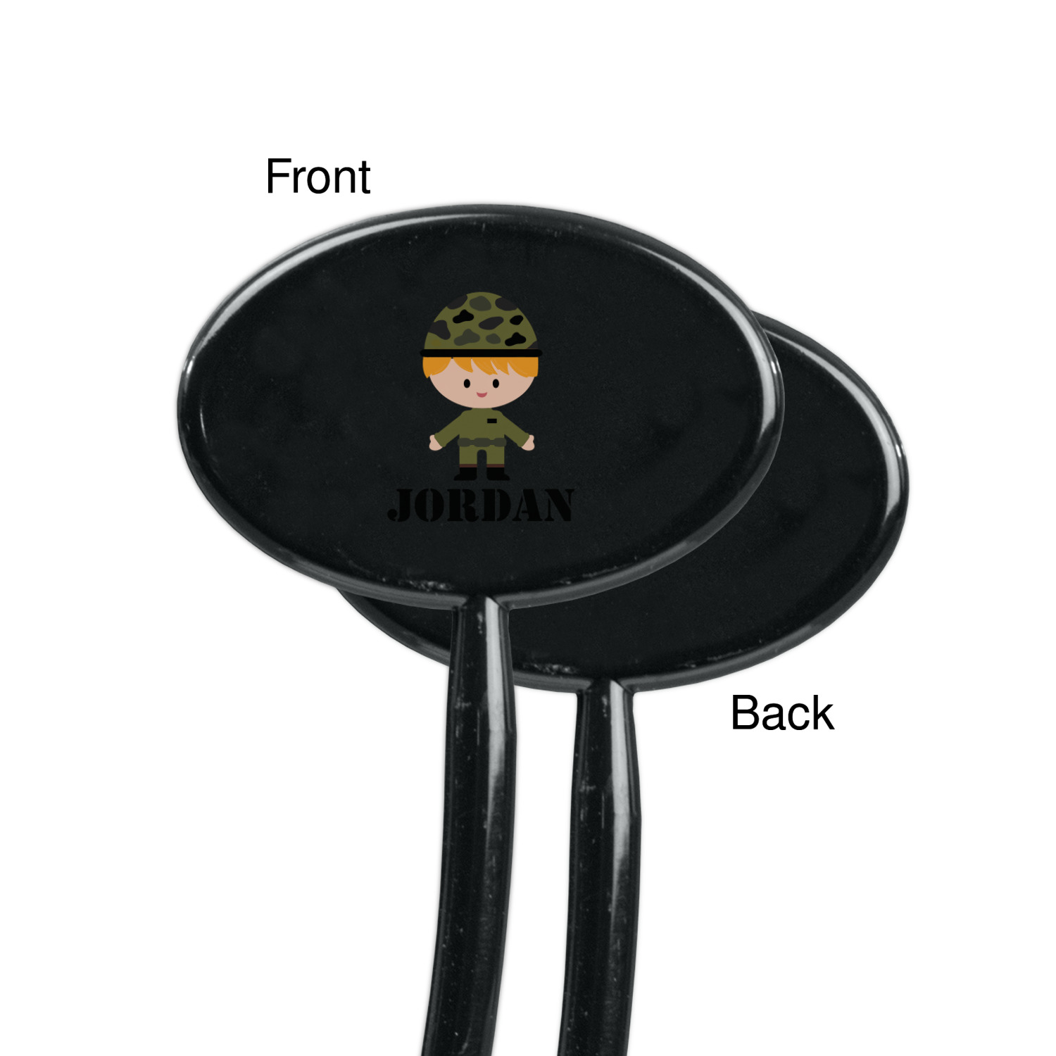 A wide band using coordinating colors runs down the middle of this design. A square label, outlined with camo colors, showcases our little military man with added personalization for the special touch.