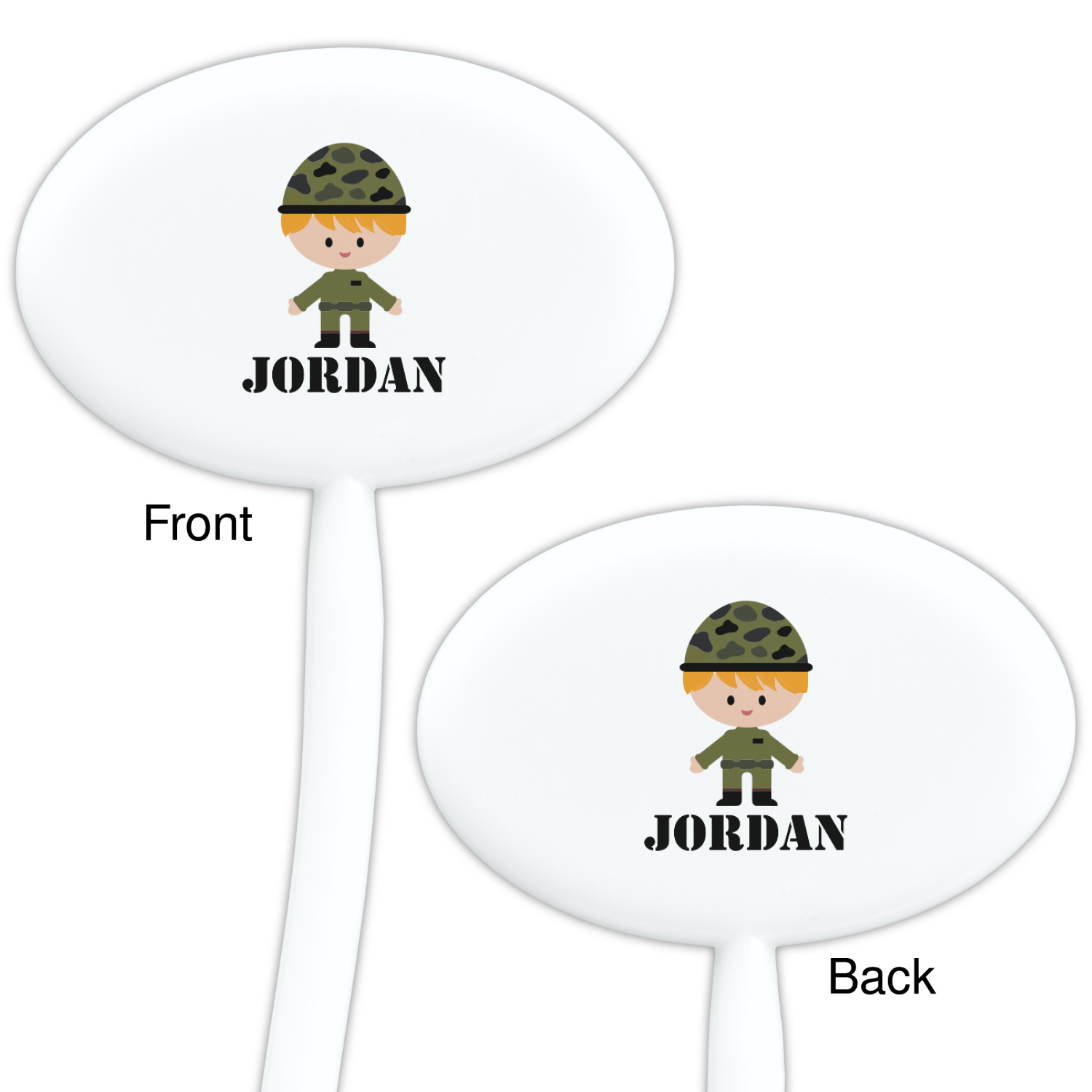 A wide band using coordinating colors runs down the middle of this design. A square label, outlined with camo colors, showcases our little military man with added personalization for the special touch.