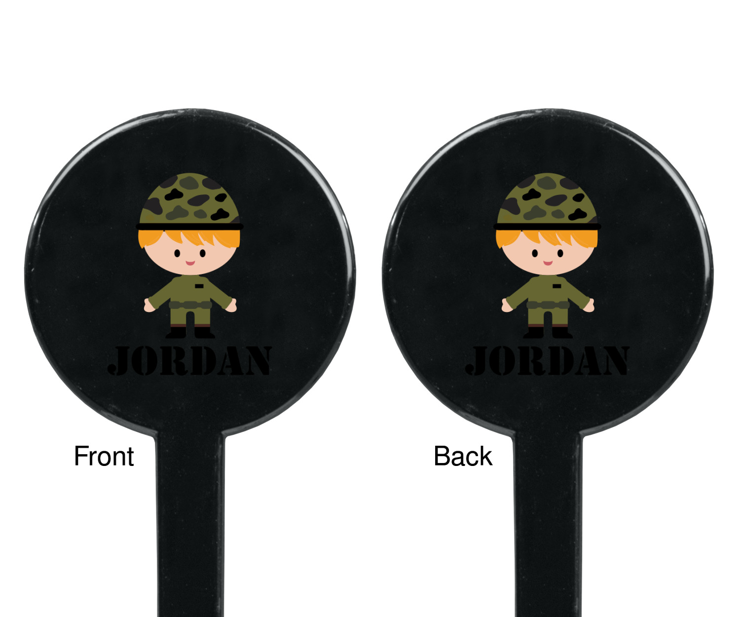 A wide band using coordinating colors runs down the middle of this design. A square label, outlined with camo colors, showcases our little military man with added personalization for the special touch.