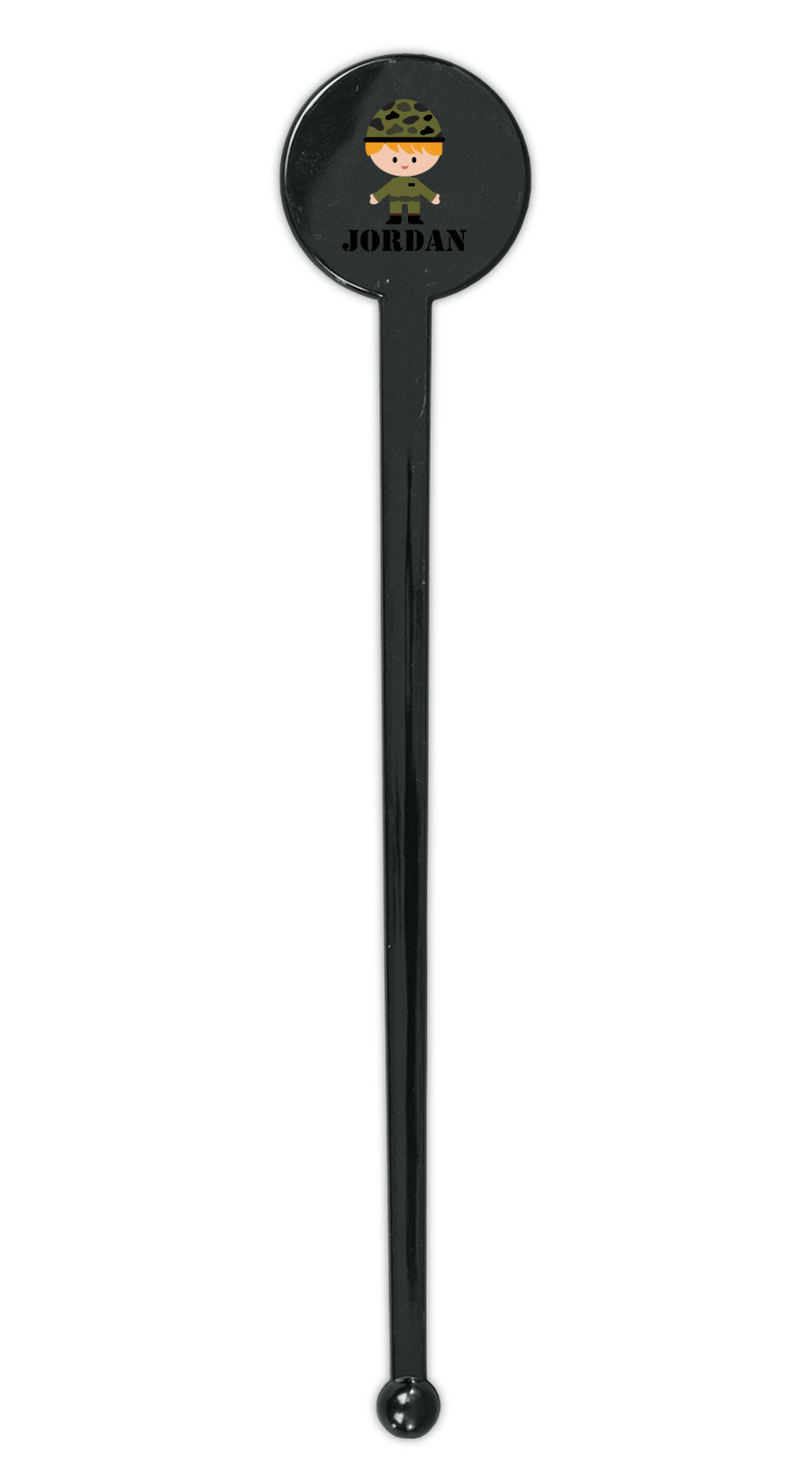 A wide band using coordinating colors runs down the middle of this design. A square label, outlined with camo colors, showcases our little military man with added personalization for the special touch.