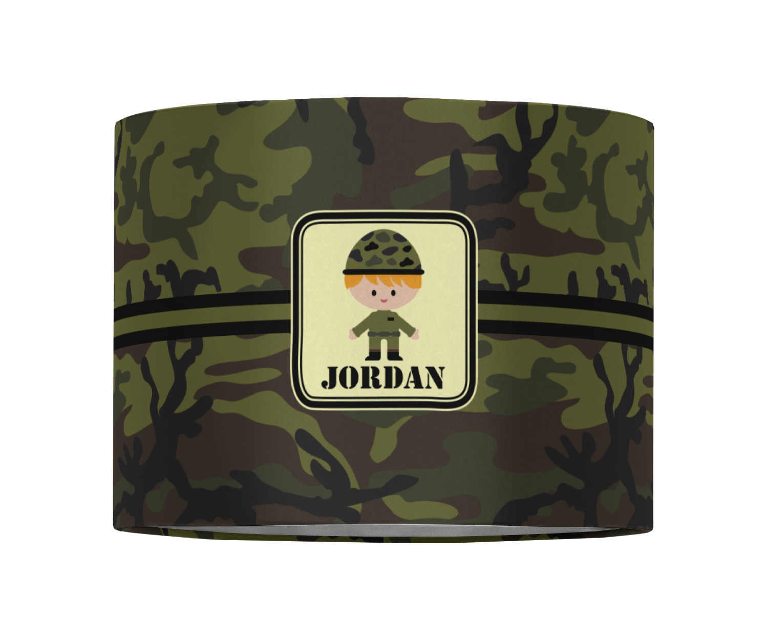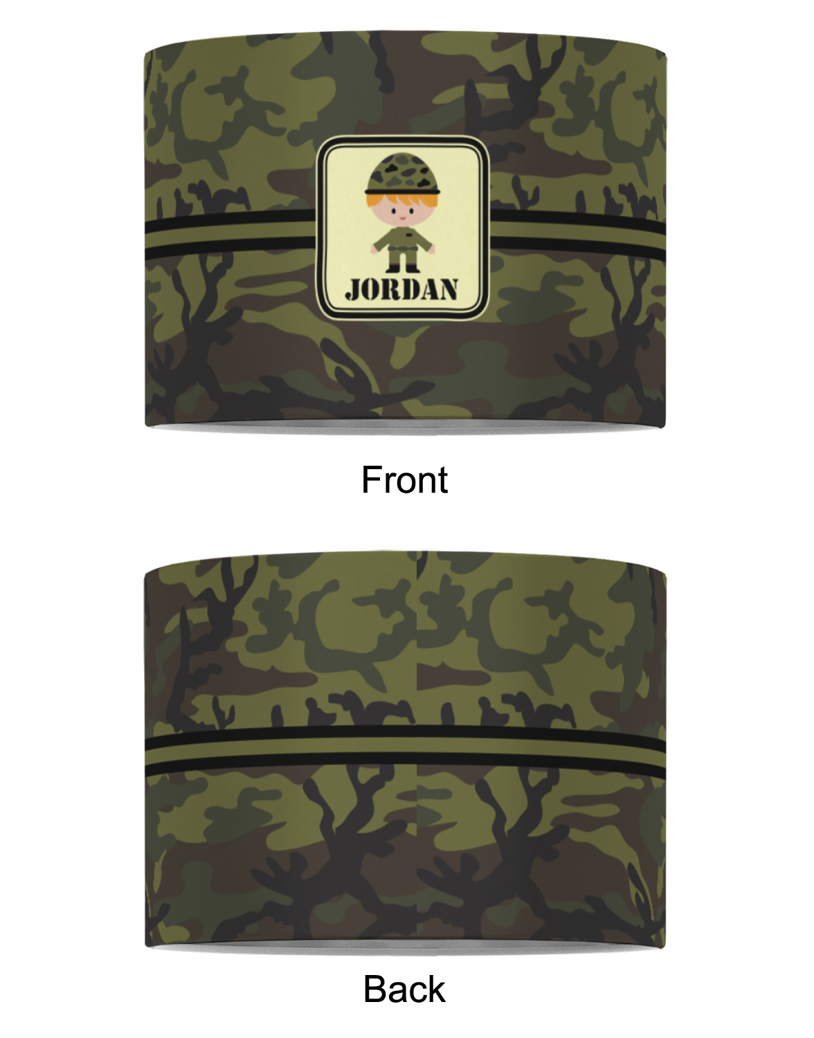 A wide band using coordinating colors runs down the middle of this design. A square label, outlined with camo colors, showcases our little military man with added personalization for the special touch.